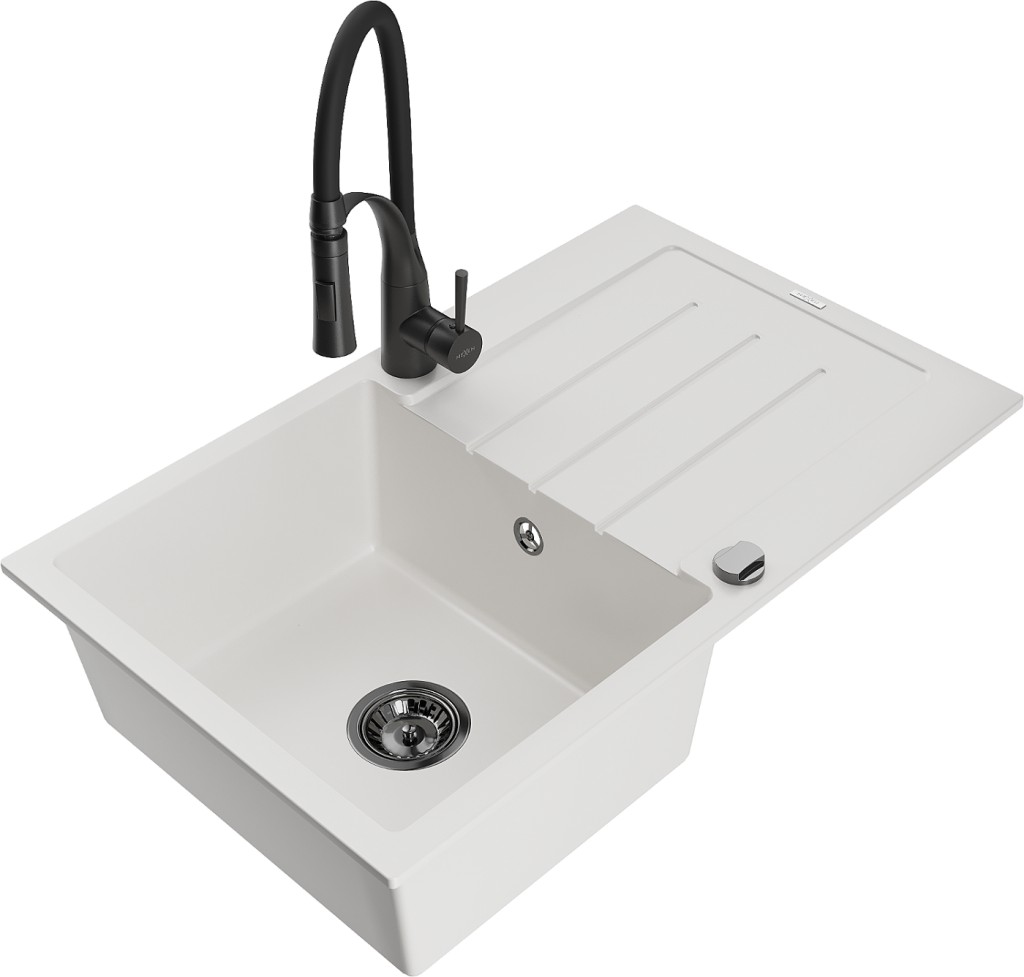 Technické dáta: drez: Rozmer: 795 x 495 x 200 mm Hĺbka komory: 200 mm Rozmery komory: 440x360 mm Priemer odtoku: ø90 mm Typ: 1-miska s odkvapkávačom Typ: Zapustené do pracovnej dosky biela farba Povrchová úprava sifónu: čierna Materiál: žula (80% žulové kamenivo, 20% živice) Prepadový otvor: Áno Otvory: (batérie, automatické) 2 Inštalácia: Univerzálna, je možné inštalovať s odkvapkávačom na ľavú alebo pravú stranu Vysoká odolnosť proti poškriabaniu a zmene farby Odolnosť proti tepelným šokom Ľahko čistiteľný povrch Dva dodatočné vyfrézované otvory na samodierovanie ø35 kuchynská batéria: Materiál: mosadz Čierna farba Hlava: Keramická Prevzdušňovač: Áno Typ: Jedna páka Výška batérie: 430 mm Rozsah výtoku: 185 mm Batéria má výsuvný výtok(GT) Ean: 5905315046765