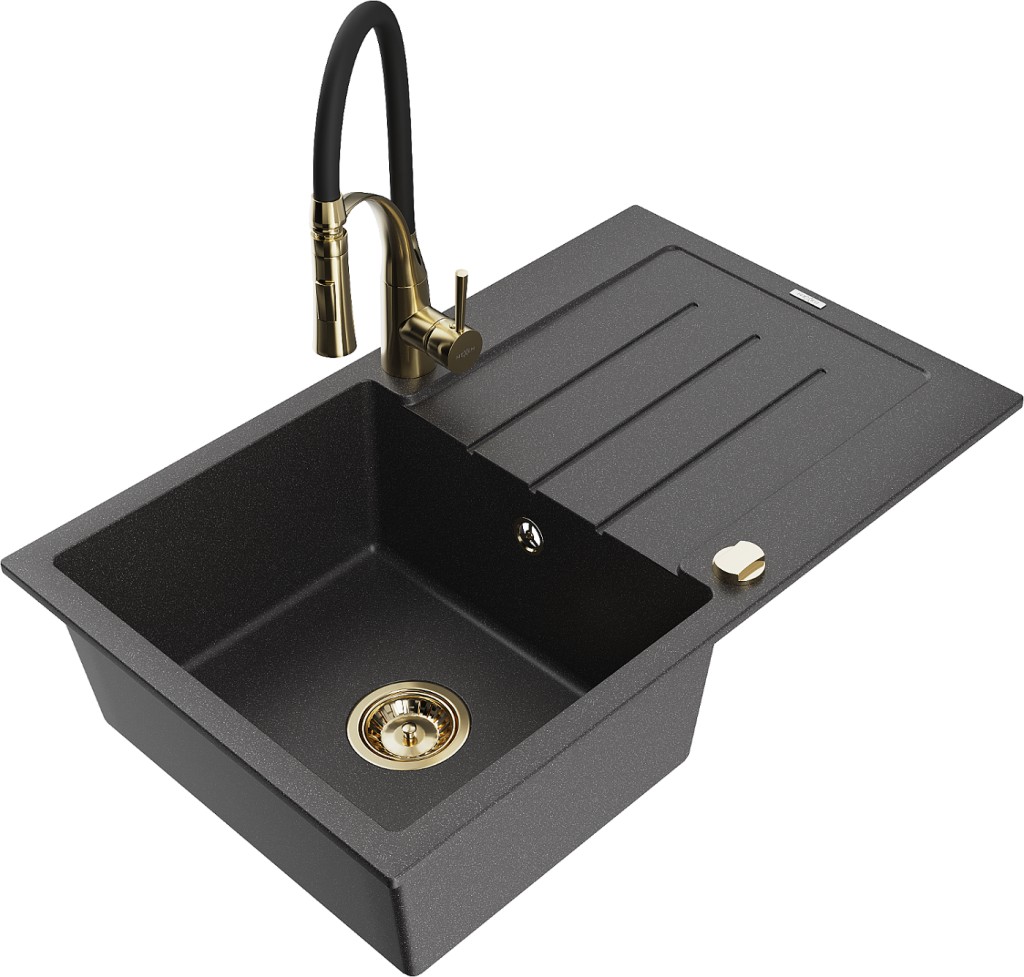 Technické dáta: drez: Rozmer: 795 x 495 x 200 mm Hĺbka komory: 200 mm Rozmery komory: 440x360 mm Priemer odtoku: ø90 mm Typ: 1-miska s odkvapkávačom Typ: Zapustené do pracovnej dosky Farba: Škvrnitá čierna Povrchová úprava sifónu: zlatá Materiál: žula (80% žulové kamenivo, 20% živice) Prepadový otvor: Áno Otvory: (batérie, automatické) 2 Inštalácia: Univerzálna, je možné inštalovať s odkvapkávačom na ľavú alebo pravú stranu Vysoká odolnosť proti poškriabaniu a zmene farby Odolnosť proti tepelným šokom Ľahko čistiteľný povrch Dva dodatočné vyfrézované otvory na samodierovanie ø35 kuchynská batéria: Materiál: mosadz Farba: Zlatá/Čierna Hlava: Keramická Prevzdušňovač: Áno Typ: Jedna páka Výška batérie: 430 mm Rozsah výtoku: 185 mm Batéria má výsuvný výtok(GT) Ean: 5905315047045