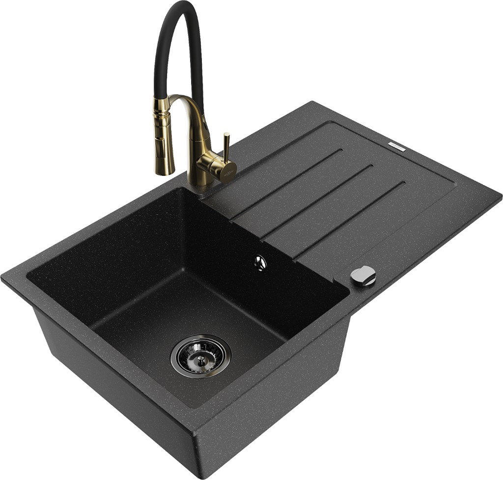 Technické dáta: drez: Rozmer: 795 x 495 x 200 mm Hĺbka komory: 200 mm Rozmery komory: 440x360 mm Priemer odtoku: ø90 mm Typ: 1-miska s odkvapkávačom Typ: Zapustené do pracovnej dosky Farba: čierna/strieborná metalíza Povrchová úprava sifónu: čierna Materiál: žula (80% žulové kamenivo, 20% živice) Prepadový otvor: Áno Otvory: (batérie, automatické) 2 Inštalácia: Univerzálna, je možné inštalovať s odkvapkávačom na ľavú alebo pravú stranu Vysoká odolnosť proti poškriabaniu a zmene farby Odolnosť proti tepelným šokom Ľahko čistiteľný povrch Dva dodatočné vyfrézované otvory na samodierovanie ø35 kuchynská batéria: Materiál: mosadz Farba: Zlatá/Čierna Hlava: Keramická Prevzdušňovač: Áno Typ: Jedna páka Výška batérie: 430 mm Rozsah výtoku: 185 mm Batéria má výsuvný výtok(GT) Ean: 5905315046932