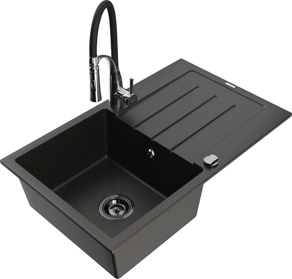 Technické dáta: drez: Rozmer: 795 x 495 x 200 mm Hĺbka komory: 200 mm Rozmery komory: 440x360 mm Priemer odtoku: ø90 mm Typ: 1-miska s odkvapkávačom Typ: Zapustené do pracovnej dosky Farba: čierna / zlatá metalíza Povrchová úprava sifónu: čierna Materiál: žula (80% žulové kamenivo, 20% živice) Prepadový otvor: Áno Otvory: (batérie, automatické) 2 Inštalácia: Univerzálna, je možné inštalovať s odkvapkávačom na ľavú alebo pravú stranu Vysoká odolnosť proti poškriabaniu a zmene farby Odolnosť proti tepelným šokom Ľahko čistiteľný povrch Dva dodatočné vyfrézované otvory na samodierovanie ø35 kuchynská batéria: Materiál: mosadz Farba: chróm/čierna Hlava: Keramická Prevzdušňovač: Áno Typ: Jedna páka Výška batérie: 430 mm Rozsah výtoku: 185 mm Batéria má výsuvný výtok(GT) Ean: 5905315046970