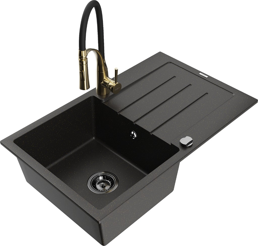 Technické dáta: drez: Rozmer: 795 x 495 x 200 mm Hĺbka komory: 200 mm Rozmery komory: 440x360 mm Priemer odtoku: ø90 mm Typ: 1-miska s odkvapkávačom Typ: Zapustené do pracovnej dosky Farba: čierna / zlatá metalíza Povrchová úprava sifónu: čierna Materiál: žula (80% žulové kamenivo, 20% živice) Prepadový otvor: Áno Otvory: (batérie, automatické) 2 Inštalácia: Univerzálna, je možné inštalovať s odkvapkávačom na ľavú alebo pravú stranu Vysoká odolnosť proti poškriabaniu a zmene farby Odolnosť proti tepelným šokom Ľahko čistiteľný povrch Dva dodatočné vyfrézované otvory na samodierovanie ø35 kuchynská batéria: Materiál: mosadz Farba: Zlatá/Čierna Hlava: Keramická Prevzdušňovač: Áno Typ: Jedna páka Výška batérie: 430 mm Rozsah výtoku: 185 mm Batéria má výsuvný výtok(GT) Ean: 5905315046994