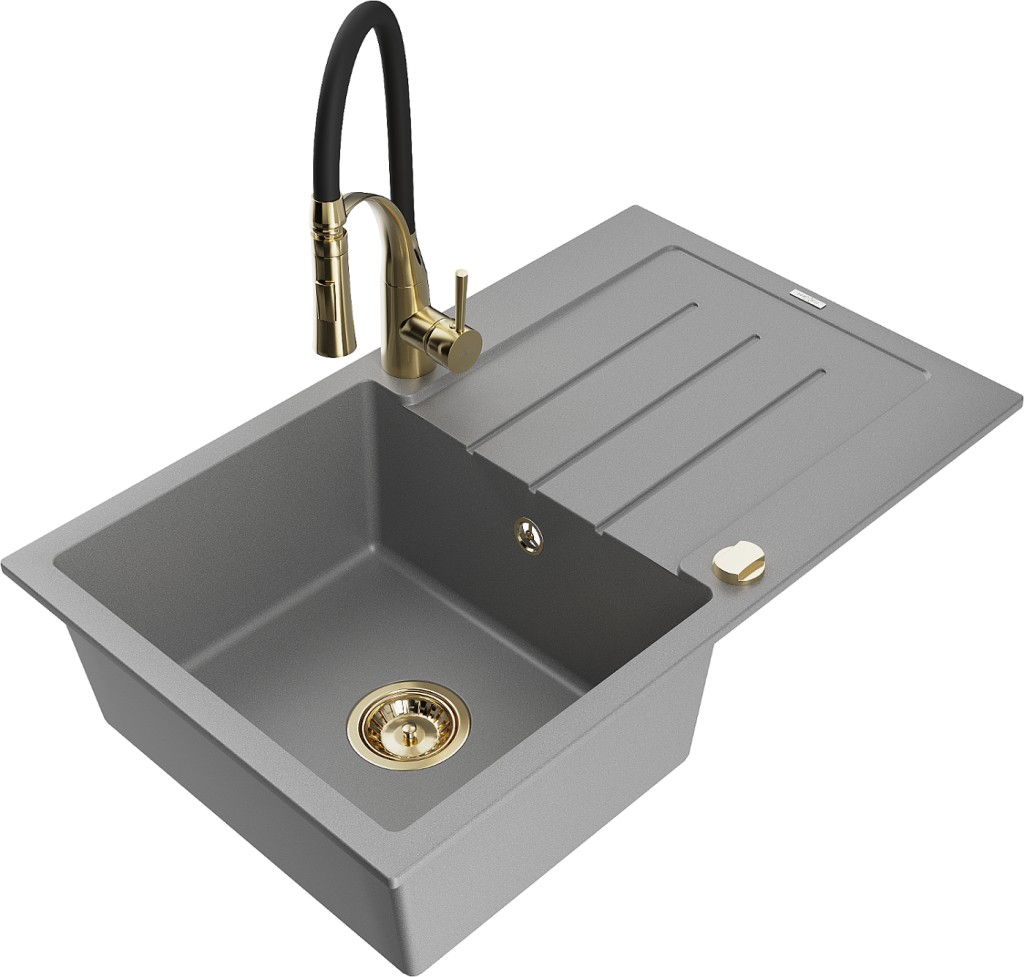 Technické dáta: drez: Rozmer: 795 x 495 x 200 mm Hĺbka komory: 200 mm Rozmery komory: 440x360 mm Priemer odtoku: ø90 mm Typ: 1-miska s odkvapkávačom Typ: Zapustené do pracovnej dosky Šedá farba Povrchová úprava sifónu: zlatá Materiál: žula (80% žulové kamenivo, 20% živice) Prepadový otvor: Áno Otvory: (batérie, automatické) 2 Inštalácia: Univerzálna, je možné inštalovať s odkvapkávačom na ľavú alebo pravú stranu Vysoká odolnosť proti poškriabaniu a zmene farby Odolnosť proti tepelným šokom Ľahko čistiteľný povrch Dva dodatočné vyfrézované otvory na samodierovanie ø35 kuchynská batéria: Materiál: mosadz Farba: Zlatá/Čierna Hlava: Keramická Prevzdušňovač: Áno Typ: Jedna páka Výška batérie: 430 mm Rozsah výtoku: 185 mm Batéria má výsuvný výtok(GT) Ean: 5905315046864