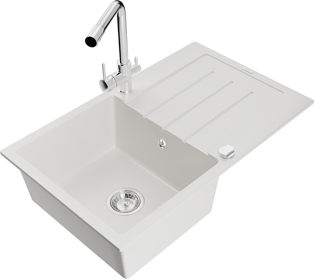 Technické dáta: drez: Rozmer: 795 x 495 x 200 mm Hĺbka komory: 200 mm Rozmery komory: 440x360 mm Priemer odtoku: ø90 mm Typ: 1-miska s odkvapkávačom Typ: Zapustené do pracovnej dosky biela farba Povrchová úprava sifónu: Chrome Materiál: žula (80% žulové kamenivo, 20% živice) Prepadový otvor: Áno Otvory: (batérie, automatické) 2 Inštalácia: Univerzálna, je možné inštalovať s odkvapkávačom na ľavú alebo pravú stranu Vysoká odolnosť proti poškriabaniu a zmene farby Odolnosť proti tepelným šokom Ľahko čistiteľný povrch Dva dodatočné vyfrézované otvory na samodierovanie ø35 kuchynská batéria: Materiál: mosadz Farba: Chrome Hlava: Keramická Prevzdušňovač: Áno Typ: Dve rukoväte Rozsah výtoku: 235 mm Výška batérie: 315 mm Dvojhlavá batéria s prídavným kanálom pre filtrovanú pitnú vodu(GT) Ean: 5905315025210