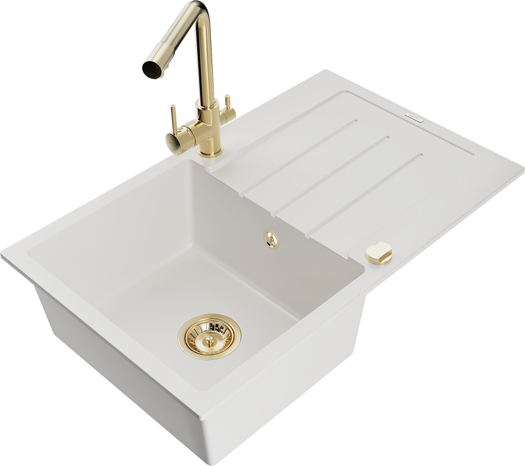 Technické dáta: drez: Rozmer: 795 x 495 x 200 mm Hĺbka komory: 200 mm Rozmery komory: 440x360 mm Priemer odtoku: ø90 mm Typ: 1-miska s odkvapkávačom Typ: Zapustené do pracovnej dosky biela farba Povrchová úprava sifónu: zlatá Materiál: žula (80% žulové kamenivo, 20% živice) Prepadový otvor: Áno Otvory: (batérie, automatické) 2 Inštalácia: Univerzálna, je možné inštalovať s odkvapkávačom na ľavú alebo pravú stranu Vysoká odolnosť proti poškriabaniu a zmene farby Odolnosť proti tepelným šokom Ľahko čistiteľný povrch Dva dodatočné vyfrézované otvory na samodierovanie ø35 kuchynská batéria: Materiál: mosadz Farba: Zlatá Hlava: Keramická Prevzdušňovač: Áno Typ: Dve rukoväte Rozsah výtoku: 235 mm Výška batérie: 315 mm Dvojhlavá batéria s prídavným kanálom pre filtrovanú pitnú vodu(GT) Ean: 5905315025234