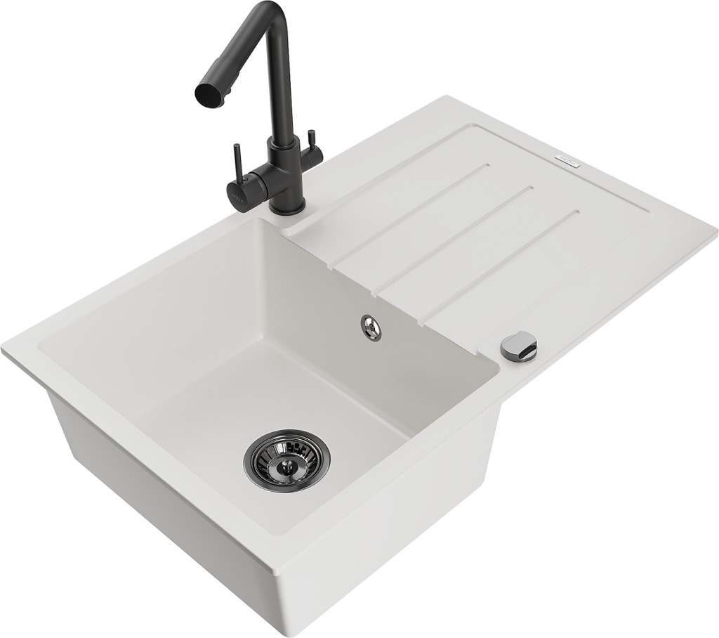 Technické dáta: drez: Rozmer: 795 x 495 x 200 mm Hĺbka komory: 200 mm Rozmery komory: 440x360 mm Priemer odtoku: ø90 mm Typ: 1-miska s odkvapkávačom Typ: Zapustené do pracovnej dosky biela farba Povrchová úprava sifónu: čierna Materiál: žula (80% žulové kamenivo, 20% živice) Prepadový otvor: Áno Otvory: (batérie, automatické) 2 Inštalácia: Univerzálna, je možné inštalovať s odkvapkávačom na ľavú alebo pravú stranu Vysoká odolnosť proti poškriabaniu a zmene farby Odolnosť proti tepelným šokom Ľahko čistiteľný povrch Dva dodatočné vyfrézované otvory na samodierovanie ø35 kuchynská batéria: Materiál: mosadz Čierna farba Hlava: Keramická Prevzdušňovač: Áno Typ: Dve rukoväte Rozsah výtoku: 235 mm Výška batérie: 315 mm Dvojhlavá batéria s prídavným kanálom pre filtrovanú pitnú vodu(GT) Ean: 5905315025241