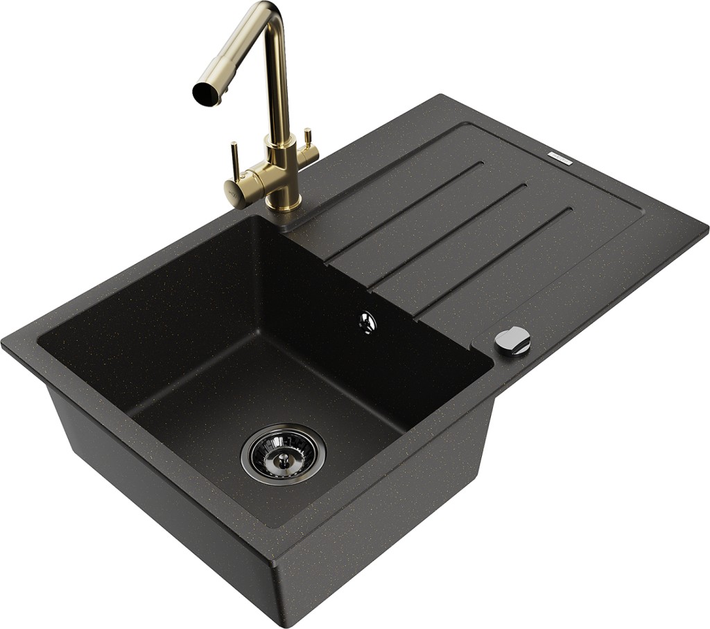 Technické dáta: drez: Rozmer: 795 x 495 x 200 mm Hĺbka komory: 200 mm Rozmery komory: 440x360 mm Priemer odtoku: ø90 mm Typ: 1-miska s odkvapkávačom Typ: Zapustené do pracovnej dosky Farba: čierna / zlatá metalíza Povrchová úprava sifónu: čierna Materiál: žula (80% žulové kamenivo, 20% živice) Prepadový otvor: Áno Otvory: (batérie, automatické) 2 Inštalácia: Univerzálna, je možné inštalovať s odkvapkávačom na ľavú alebo pravú stranu Vysoká odolnosť proti poškriabaniu a zmene farby Odolnosť proti tepelným šokom Ľahko čistiteľný povrch Dva dodatočné vyfrézované otvory na samodierovanie ø35 kuchynská batéria: Materiál: mosadz Farba: Zlatá Hlava: Keramická Prevzdušňovač: Áno Typ: Dve rukoväte Rozsah výtoku: 235 mm Výška batérie: 315 mm Dvojhlavá batéria s prídavným kanálom pre filtrovanú pitnú vodu(GT) Ean: 5905315025401