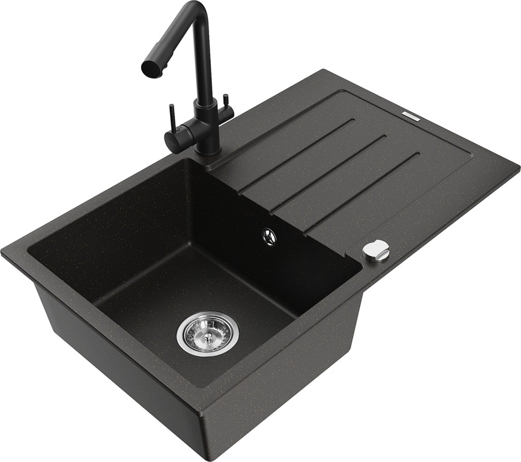 Technické dáta: drez: Rozmer: 795 x 495 x 200 mm Hĺbka komory: 200 mm Rozmery komory: 440x360 mm Priemer odtoku: ø90 mm Typ: 1-miska s odkvapkávačom Typ: Zapustené do pracovnej dosky Farba: čierna / zlatá metalíza Povrchová úprava sifónu: Chrome Materiál: žula (80% žulové kamenivo, 20% živice) Prepadový otvor: Áno Otvory: (batérie, automatické) 2 Inštalácia: Univerzálna, je možné inštalovať s odkvapkávačom na ľavú alebo pravú stranu Vysoká odolnosť proti poškriabaniu a zmene farby Odolnosť proti tepelným šokom Ľahko čistiteľný povrch Dva dodatočné vyfrézované otvory na samodierovanie ø35 kuchynská batéria: Materiál: mosadz Čierna farba Hlava: Keramická Prevzdušňovač: Áno Typ: Dve rukoväte Rozsah výtoku: 235 mm Výška batérie: 315 mm Dvojhlavá batéria s prídavným kanálom pre filtrovanú pitnú vodu(GT) Ean: 5905315025425