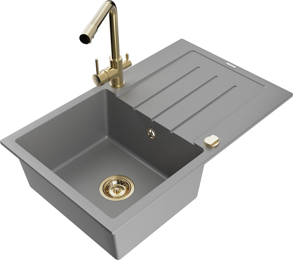 Technické dáta: drez: Rozmer: 795 x 495 x 200 mm Hĺbka komory: 200 mm Rozmery komory: 440x360 mm Priemer odtoku: ø90 mm Typ: 1-miska s odkvapkávačom Typ: Zapustené do pracovnej dosky Šedá farba Povrchová úprava sifónu: zlatá Materiál: žula (80% žulové kamenivo, 20% živice) Prepadový otvor: Áno Otvory: (batérie, automatické) 2 Inštalácia: Univerzálna, je možné inštalovať s odkvapkávačom na ľavú alebo pravú stranu Vysoká odolnosť proti poškriabaniu a zmene farby Odolnosť proti tepelným šokom Ľahko čistiteľný povrch Dva dodatočné vyfrézované otvory na samodierovanie ø35 kuchynská batéria: Materiál: mosadz Farba: Zlatá Hlava: Keramická Prevzdušňovač: Áno Typ: Dve rukoväte Rozsah výtoku: 235 mm Výška batérie: 315 mm Dvojhlavá batéria s prídavným kanálom pre filtrovanú pitnú vodu(GT) Ean: 5905315025302