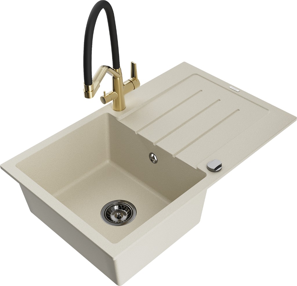 Technické dáta: drez: Rozmer: 795 x 495 x 200 mm Hĺbka komory: 200 mm Rozmery komory: 440x360 mm Priemer odtoku: ø90 mm Typ: 1-miska s odkvapkávačom Typ: Zapustené do pracovnej dosky Farba béžová Povrchová úprava sifónu: čierna Materiál: žula (80% žulové kamenivo, 20% živice) Prepadový otvor: Áno Otvory: (batérie, automatické) 2 Inštalácia: Univerzálna, je možné inštalovať s odkvapkávačom na ľavú alebo pravú stranu Vysoká odolnosť proti poškriabaniu a zmene farby Odolnosť proti tepelným šokom Ľahko čistiteľný povrch Dva dodatočné vyfrézované otvory na samodierovanie ø35 kuchynská batéria: Materiál: mosadz Farba: Zlatá/Čierna Hlavy: Keramické Prevzdušňovač: Áno Typ hubica: Flexibilný s mosadzným držiakom Rozsah výtoku: 260 mm Výška: 405 mm Typ: Dve rukoväte Dvojhlavá batéria s prídavným filtrom na pitnú vodu(GT) Ean: 5905315101976