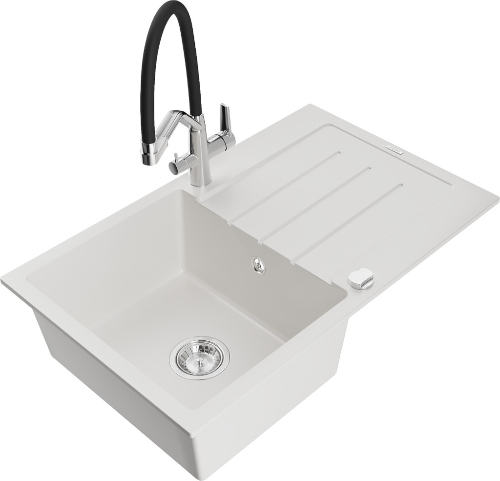 Technické dáta: drez: Rozmer: 795 x 495 x 200 mm Hĺbka komory: 200 mm Rozmery komory: 440x360 mm Priemer odtoku: ø90 mm Typ: 1-miska s odkvapkávačom Typ: Zapustené do pracovnej dosky biela farba Povrchová úprava sifónu: Chrome Materiál: žula (80% žulové kamenivo, 20% živice) Prepadový otvor: Áno Otvory: (batérie, automatické) 2 Inštalácia: Univerzálna, je možné inštalovať s odkvapkávačom na ľavú alebo pravú stranu Vysoká odolnosť proti poškriabaniu a zmene farby Odolnosť proti tepelným šokom Ľahko čistiteľný povrch Dva dodatočné vyfrézované otvory na samodierovanie ø35 kuchynská batéria: Materiál: mosadz Farba: chróm/čierna Hlavy: Keramické Prevzdušňovač: Áno Typ hubica: Flexibilný s mosadzným držiakom Rozsah výtoku: 260 mm Výška: 405 mm Typ: Dve rukoväte Dvojhlavá batéria s prídavným filtrom na pitnú vodu(GT) Ean: 5905315101891