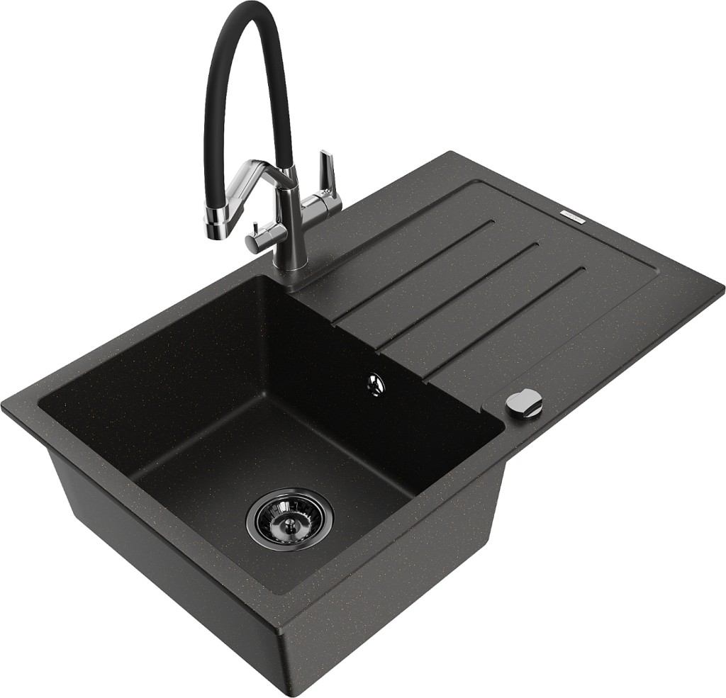 Technické dáta: drez: Rozmer: 795 x 495 x 200 mm Hĺbka komory: 200 mm Rozmery komory: 440x360 mm Priemer odtoku: ø90 mm Typ: 1-miska s odkvapkávačom Typ: Zapustené do pracovnej dosky Farba: čierna / zlatá metalíza Povrchová úprava sifónu: čierna Materiál: žula (80% žulové kamenivo, 20% živice) Prepadový otvor: Áno Otvory: (batérie, automatické) 2 Inštalácia: Univerzálna, je možné inštalovať s odkvapkávačom na ľavú alebo pravú stranu Vysoká odolnosť proti poškriabaniu a zmene farby Odolnosť proti tepelným šokom Ľahko čistiteľný povrch Dva dodatočné vyfrézované otvory na samodierovanie ø35 kuchynská batéria: Materiál: mosadz Farba: chróm/čierna Hlavy: Keramické Prevzdušňovač: Áno Typ hubica: Flexibilný s mosadzným držiakom Rozsah výtoku: 260 mm Výška: 405 mm Typ: Dve rukoväte Dvojhlavá batéria s prídavným filtrom na pitnú vodu(GT) Ean: 5905315102102