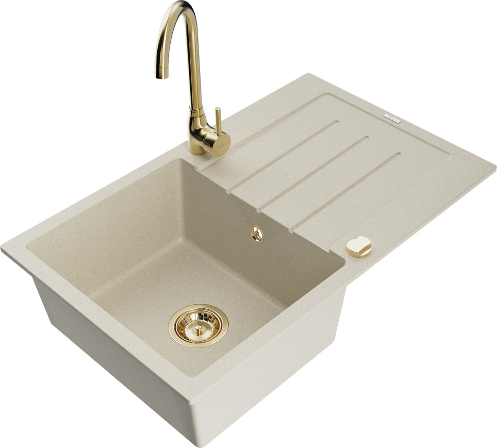 Technické dáta: drez: Rozmer: 795 x 495 x 200 mm Hĺbka komory: 200 mm Rozmery komory: 440x360 mm Priemer odtoku: ø90 mm Typ: 1-miska s odkvapkávačom Typ: Zapustené do pracovnej dosky Farba béžová Povrchová úprava sifónu: zlatá Materiál: žula (80% žulové kamenivo, 20% živice) Prepadový otvor: Áno Otvory: (batérie, automatické) 2 Inštalácia: Univerzálna, je možné inštalovať s odkvapkávačom na ľavú alebo pravú stranu Vysoká odolnosť proti poškriabaniu a zmene farby Odolnosť proti tepelným šokom Ľahko čistiteľný povrch Dva dodatočné vyfrézované otvory na samodierovanie ø35 kuchynská batéria: Materiál: mosadz Farba: Zlatá Hlava: Keramická Prevzdušňovač: Áno Typ: Jedna páka Výška batérie: 335 mm Rozsah výtoku: 180 mm(GT) Ean: 5905315015440