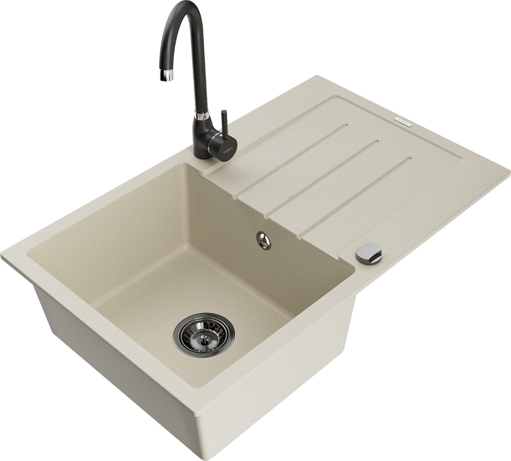 Technické dáta: drez: Rozmer: 795 x 495 x 200 mm Hĺbka komory: 200 mm Rozmery komory: 440x360 mm Priemer odtoku: ø90 mm Typ: 1-miska s odkvapkávačom Typ: Zapustené do pracovnej dosky Farba béžová Povrchová úprava sifónu: čierna Materiál: žula (80% žulové kamenivo, 20% živice) Prepadový otvor: Áno Otvory: (batérie, automatické) 2 Inštalácia: Univerzálna, je možné inštalovať s odkvapkávačom na ľavú alebo pravú stranu Vysoká odolnosť proti poškriabaniu a zmene farby Odolnosť proti tepelným šokom Ľahko čistiteľný povrch Dva dodatočné vyfrézované otvory na samodierovanie ø35 kuchynská batéria: Materiál: mosadz Čierna farba Hlava: Keramická Prevzdušňovač: Áno Typ: Jedna páka Výška batérie: 335 mm Rozsah výtoku: 180 mm(GT) Ean: 5905315015457