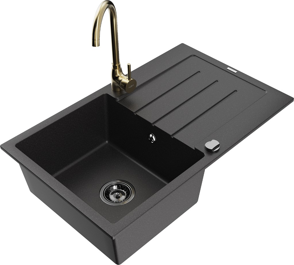 Technické dáta: drez: Rozmer: 795 x 495 x 200 mm Hĺbka komory: 200 mm Rozmery komory: 440x360 mm Priemer odtoku: ø90 mm Typ: 1-miska s odkvapkávačom Typ: Zapustené do pracovnej dosky Čierna farba Povrchová úprava sifónu: čierna Materiál: žula (80% žulové kamenivo, 20% živice) Prepadový otvor: Áno Otvory: (batérie, automatické) 2 Inštalácia: Univerzálna, je možné inštalovať s odkvapkávačom na ľavú alebo pravú stranu Vysoká odolnosť proti poškriabaniu a zmene farby Odolnosť proti tepelným šokom Ľahko čistiteľný povrch Dva dodatočné vyfrézované otvory na samodierovanie ø35 kuchynská batéria: Materiál: mosadz Farba: Zlatá Hlava: Keramická Prevzdušňovač: Áno Typ: Jedna páka Výška batérie: 335 mm Rozsah výtoku: 180 mm(GT) Ean: 5905315015570