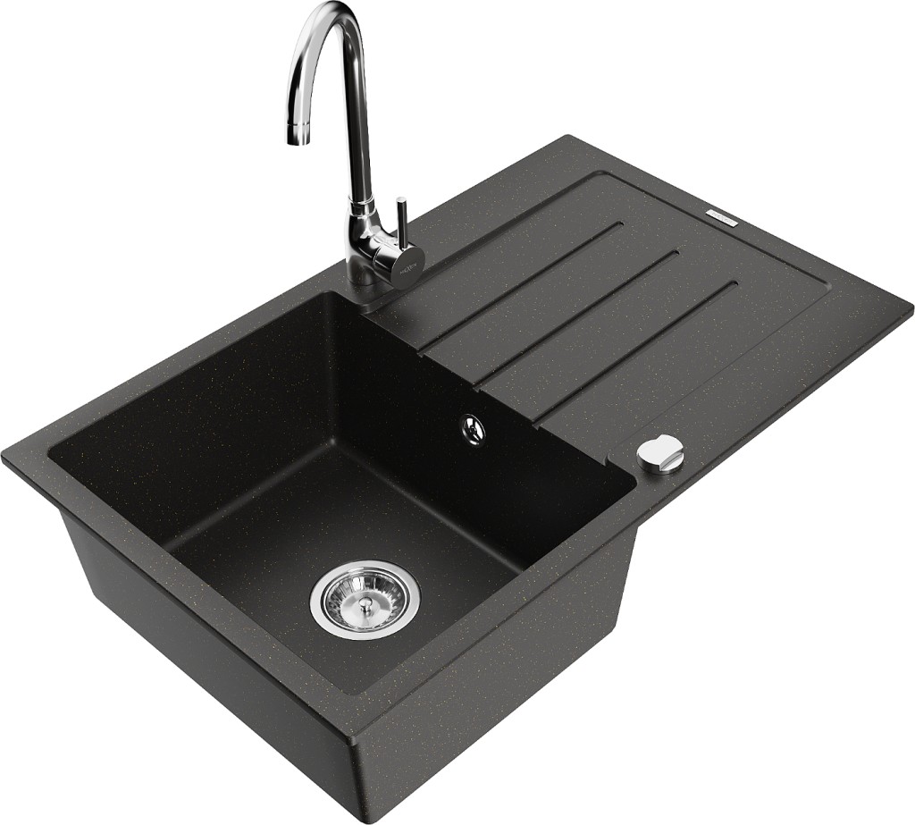 Technické dáta: drez: Rozmer: 795 x 495 x 200 mm Hĺbka komory: 200 mm Rozmery komory: 440x360 mm Priemer odtoku: ø90 mm Typ: 1-miska s odkvapkávačom Typ: Zapustené do pracovnej dosky Farba: čierna / zlatá metalíza Povrchová úprava sifónu: Chrome Materiál: žula (80% žulové kamenivo, 20% živice) Prepadový otvor: Áno Otvory: (batérie, automatické) 2 Inštalácia: Univerzálna, je možné inštalovať s odkvapkávačom na ľavú alebo pravú stranu Vysoká odolnosť proti poškriabaniu a zmene farby Odolnosť proti tepelným šokom Ľahko čistiteľný povrch Dva dodatočné vyfrézované otvory na samodierovanie ø35 kuchynská batéria: Materiál: mosadz Farba: Chrome Hlava: Keramická Prevzdušňovač: Áno Typ: Jedna páka Výška batérie: 335 mm Rozsah výtoku: 180 mm(GT) Ean: 5905315015518