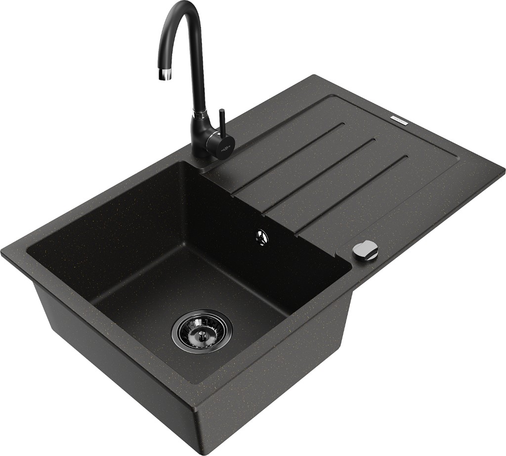 Technické dáta: drez: Rozmer: 795 x 495 x 200 mm Hĺbka komory: 200 mm Rozmery komory: 440x360 mm Priemer odtoku: ø90 mm Typ: 1-miska s odkvapkávačom Typ: Zapustené do pracovnej dosky Farba: čierna / zlatá metalíza Povrchová úprava sifónu: čierna Materiál: žula (80% žulové kamenivo, 20% živice) Prepadový otvor: Áno Otvory: (batérie, automatické) 2 Inštalácia: Univerzálna, je možné inštalovať s odkvapkávačom na ľavú alebo pravú stranu Vysoká odolnosť proti poškriabaniu a zmene farby Odolnosť proti tepelným šokom Ľahko čistiteľný povrch Dva dodatočné vyfrézované otvory na samodierovanie ø35 kuchynská batéria: Materiál: mosadz Čierna farba Hlava: Keramická Prevzdušňovač: Áno Typ: Jedna páka Výška batérie: 335 mm Rozsah výtoku: 180 mm(GT) Ean: 5905315015532