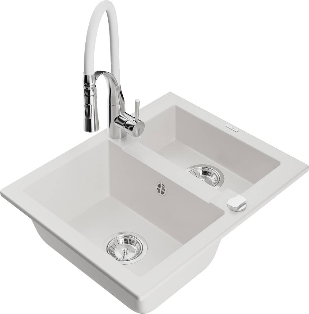 Technické dáta: drez: Rozmer: 582 x 475 x 177 mm Hĺbka komory: 162 mm (väčšia), 102 mm (menšia) Rozmery komory: 395x272 mm (väčšie), 375x182 mm (menšie) Priemer odtoku: ø90 mm Typ: 1,5 komory Typ: Zapustené do pracovnej dosky biela farba Povrchová úprava sifónu: Chrome Materiál: žula (80% žulové kamenivo, 20% živice) Prepadový otvor: Áno Otvory: (batérie, automatické) 2 Vysoká odolnosť proti poškriabaniu a zmene farby Odolnosť proti tepelným šokom Ľahko čistiteľný povrch Jeden dodatočný vyfrézovaný otvor na samodierovanie ø35 kuchynská batéria: Materiál: mosadz Farba: chróm/biela Hlava: Keramická Prevzdušňovač: Áno Typ: Jedna páka Výška batérie: 430 mm Rozsah výtoku: 185 mm Batéria má výsuvný výtok (GT) Ean: 5905315048813