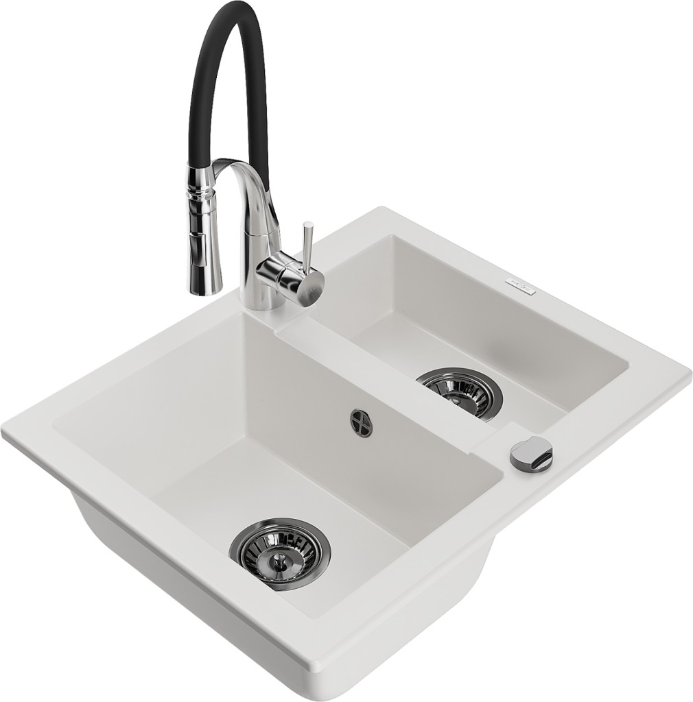 Technické dáta: drez: Rozmer: 582 x 475 x 177 mm Hĺbka komory: 162 mm (väčšia), 102 mm (menšia) Rozmery komory: 395x272 mm (väčšie), 375x182 mm (menšie) Priemer odtoku: ø90 mm Typ: 1,5 komory Typ: Zapustené do pracovnej dosky biela farba Povrchová úprava sifónu: čierna Materiál: žula (80% žulové kamenivo, 20% živice) Prepadový otvor: Áno Otvory: (batérie, automatické) 2 Vysoká odolnosť proti poškriabaniu a zmene farby Odolnosť proti tepelným šokom Ľahko čistiteľný povrch Jeden dodatočný vyfrézovaný otvor na samodierovanie ø35 kuchynská batéria: Materiál: mosadz Farba: chróm/čierna Hlava: Keramická Prevzdušňovač: Áno Typ: Jedna páka Výška batérie: 430 mm Rozsah výtoku: 185 mm Batéria má výsuvný výtok(GT) Ean: 5905315048837