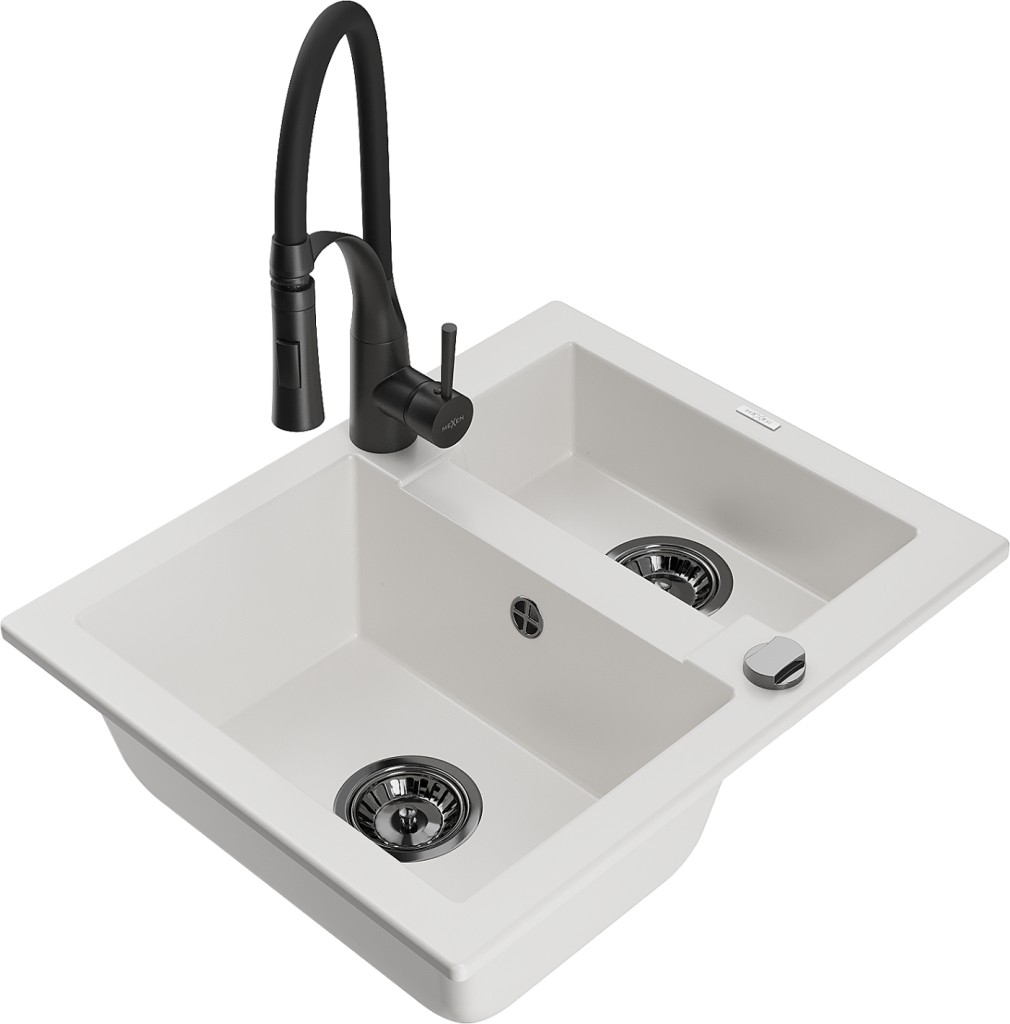 Technické dáta: drez: Rozmer: 582 x 475 x 177 mm Hĺbka komory: 162 mm (väčšia), 102 mm (menšia) Rozmery komory: 395x272 mm (väčšie), 375x182 mm (menšie) Priemer odtoku: ø90 mm Typ: 1,5 komory Typ: Zapustené do pracovnej dosky biela farba Povrchová úprava sifónu: čierna Materiál: žula (80% žulové kamenivo, 20% živice) Prepadový otvor: Áno Otvory: (batérie, automatické) 2 Vysoká odolnosť proti poškriabaniu a zmene farby Odolnosť proti tepelným šokom Ľahko čistiteľný povrch Jeden dodatočný vyfrézovaný otvor na samodierovanie ø35 kuchynská batéria: Materiál: mosadz Čierna farba Hlava: Keramická Prevzdušňovač: Áno Typ: Jedna páka Výška batérie: 430 mm Rozsah výtoku: 185 mm Batéria má výsuvný výtok(GT) Ean: 5905315048868