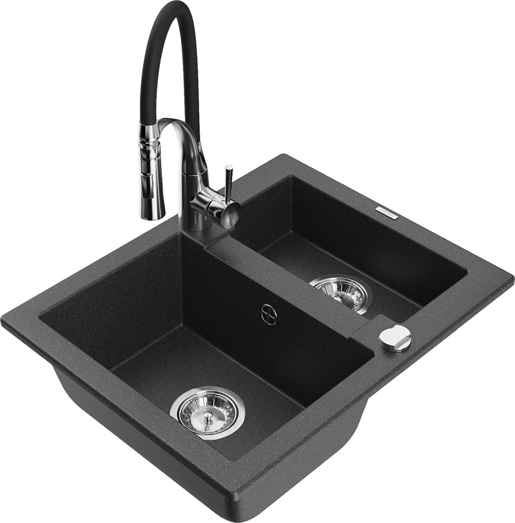 Technické dáta: Drez: Rozmer: 582x475x177 mm Hĺbka komory: 162 mm (väčšia), 102 mm (menšia) Rozmery komory: 395x272 mm (väčšie), 375x182 mm (menšie) Priemer odtoku: ø90 mm Typ: 1,5-komorový Typ: Zapustené do pracovnej dosky Farba: Škvrnitá čierna Povrchová úprava sifónu: Chrome Materiál: žula (80% žulové kamenivo 20% živice) Prepadový otvor: Áno Otvory: (batérie, automat) 2 Vysoká odolnosť proti poškriabaniu a zmene farby Odolnosť proti tepelným šokom Povrch pre ľahké čistenie Jeden dodatočný vyfrézovaný otvor na samodierovanie ø35 Kuchynská batéria: Materiál: mosadz Farba: chróm/čierna Hlava: Keramická Perlátor: Áno Typ výtoku: Flexibilný s mosadznou podperou Typ: Jednopákové Výška batérie: 430 mm Rozsah výtoku: 235 mm(GT) Ean: 5905315049124