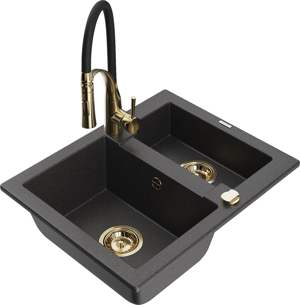 Technické dáta: Drez: Rozmer: 582x475x177 mm Hĺbka komory: 162 mm (väčšia), 102 mm (menšia) Rozmery komory: 395x272 mm (väčšie), 375x182 mm (menšie) Priemer odtoku: ø90 mm Typ: 1,5-komorový Typ: Zapustené do pracovnej dosky Farba: Škvrnitá čierna Povrchová úprava sifónu: zlatá Materiál: žula (80% žulové kamenivo 20% živice) Prepadový otvor: Áno Otvory: (batérie, automat) 2 Vysoká odolnosť proti poškriabaniu a zmene farby Odolnosť proti tepelným šokom Povrch pre ľahké čistenie Jeden dodatočný vyfrézovaný otvor na samodierovanie ø35 Kuchynská batéria: Materiál: mosadz Farba: Zlatá/Čierna Hlava: Keramická Perlátor: Áno Typ výtoku: Flexibilný s mosadzným držiakom Typ: Jednopáková Výška batérie: 430 mm Rozsah výtoku: 235 mm(GT) Ean: 5905315049148
