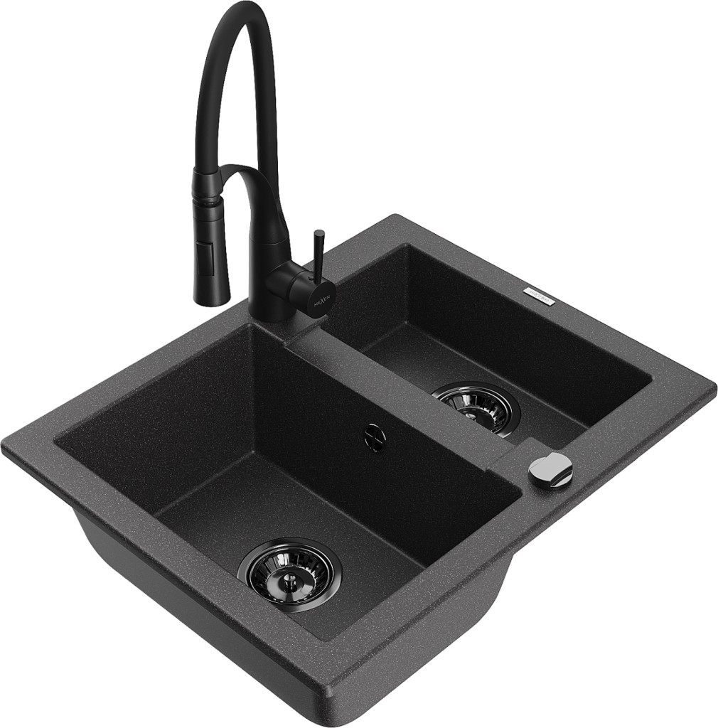 Technické dáta: Drez: Rozmer: 582x475x177 mm Hĺbka komory: 162 mm (väčšia), 102 mm (menšia) Rozmery komory: 395x272 mm (väčšie), 375x182 mm (menšie) Priemer odtoku: ø90 mm Typ: 1,5-komorový Typ: Zapustené do pracovnej dosky Farba: Škvrnitá čierna Povrchová úprava sifónu: čierna Materiál: žula (80% žulové kamenivo 20% živice) Prepadový otvor: Áno Otvory: (batérie, automat) 2 Vysoká odolnosť proti poškriabaniu a zmene farby Odolnosť proti tepelným šokom Povrch pre ľahké čistenie Jeden dodatočný vyfrézovaný otvor na samodierovanie ø35 Kuchynská batéria: Materiál: mosadz Čierna farba Hlava: Keramická Perlátor: Áno Typ výtoku: Flexibilný s mosadznou podperou Typ: Jednopákové Výška batérie: 430 mm Rozsah výtoku: 235 mm(GT) Ean: 5905315049162