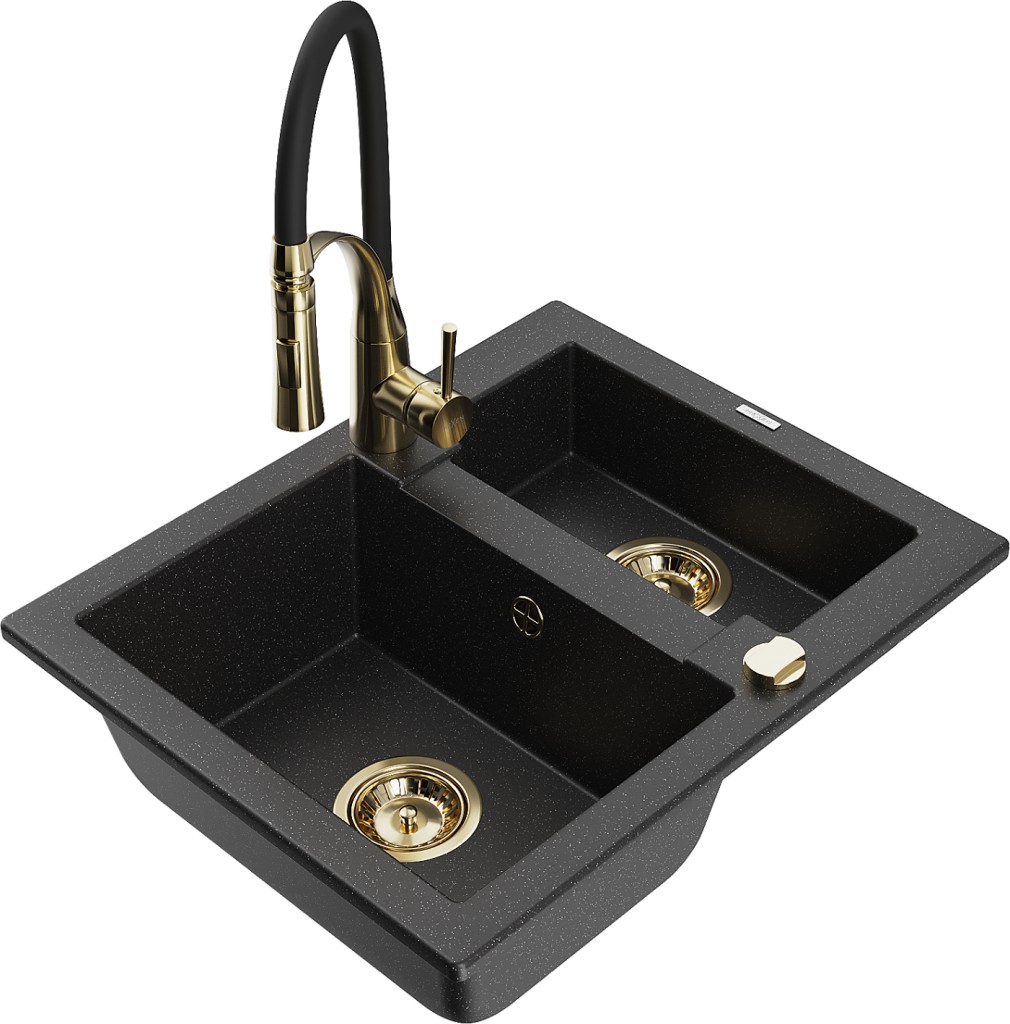 Technické dáta: Drez: Rozmer: 582x475x177 mm Hĺbka komory: 162 mm (väčšia), 102 mm (menšia) Rozmery komory: 395x272 mm (väčšie), 375x182 mm (menšie) Priemer odtoku: ø90 mm Typ: 1,5-komorový Typ: Zapustené do pracovnej dosky Farba: čierna/strieborná metalíza Povrchová úprava sifónu: zlatá Materiál: žula (80% žulové kamenivo 20% živice) Prepadový otvor: Áno Otvory: (batérie, automat) 2 Vysoká odolnosť proti poškriabaniu a zmene farby Odolnosť proti tepelným šokom Povrch pre ľahké čistenie Jeden dodatočný vyfrézovaný otvor na samodierovanie ø35 Kuchynská batéria: Materiál: mosadz Farba: Zlatá/Čierna Hlava: Keramická Perlátor: Áno Typ výtoku: Flexibilný s mosadznou podperou Typ: Jednopáková Výška batérie: 430 mm Rozsah výtoku: 235 mm(GT) Ean: 5905315049025