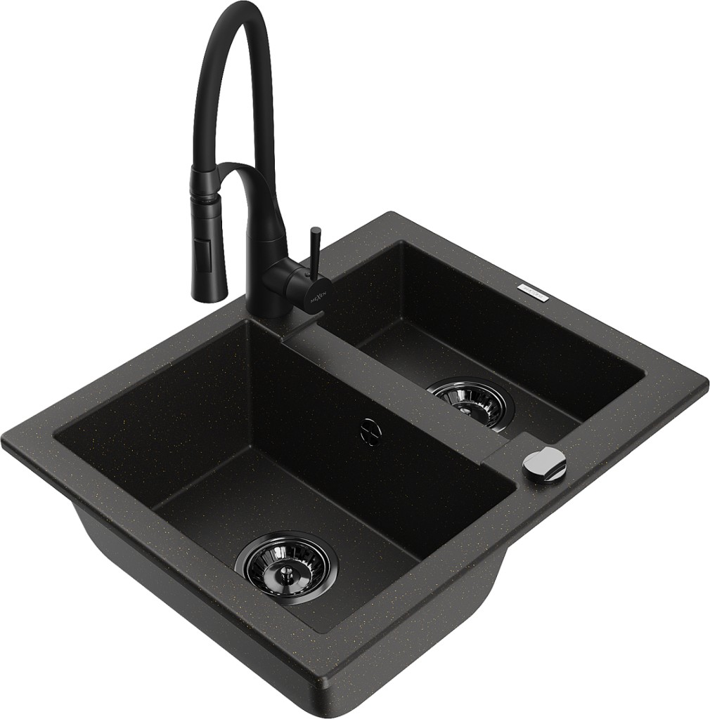 Technické dáta: drez: Rozmer: 582 x 475 x 177 mm Hĺbka komory: 162 mm (väčšia), 102 mm (menšia) Rozmery komory: 395x272 mm (väčšie), 375x182 mm (menšie) Priemer odtoku: ø90 mm Typ: 1,5 komory Typ: Zapustené do pracovnej dosky Farba: čierna / zlatá metalíza Povrchová úprava sifónu: čierna Materiál: žula (80% žulové kamenivo, 20% živice) Prepadový otvor: Áno Otvory: (batérie, automatické) 2 Vysoká odolnosť proti poškriabaniu a zmene farby Odolnosť proti tepelným šokom Ľahko čistiteľný povrch Jeden dodatočný vyfrézovaný otvor na samodierovanie ø35 kuchynská batéria: Materiál: mosadz Čierna farba Hlava: Keramická Prevzdušňovač: Áno Typ: Jedna páka Výška batérie: 430 mm Rozsah výtoku: 185 mm Batéria má výsuvný výtok(GT) Ean: 5905315049100