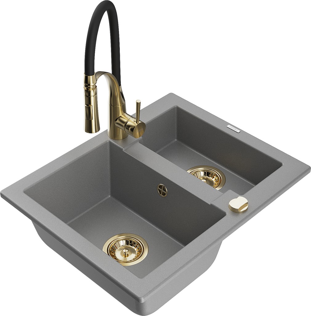 Technické dáta: drez: Rozmer: 582 x 475 x 177 mm Hĺbka komory: 162 mm (väčšia), 102 mm (menšia) Rozmery komory: 395x272 mm (väčšie), 375x182 mm (menšie) Priemer odtoku: ø90 mm Typ: 1,5 komory Typ: Zapustené do pracovnej dosky Šedá farba Povrchová úprava sifónu: zlatá Materiál: žula (80% žulové kamenivo, 20% živice) Prepadový otvor: Áno Otvory: (batérie, automatické) 2 Vysoká odolnosť proti poškriabaniu a zmene farby Odolnosť proti tepelným šokom Ľahko čistiteľný povrch Jeden dodatočný vyfrézovaný otvor na samodierovanie ø35 kuchynská batéria: Materiál: mosadz Farba: Zlatá/Čierna Hlava: Keramická Prevzdušňovač: Áno Typ: Jedna páka Výška batérie: 430 mm Rozsah výtoku: 185 mm Batéria má výsuvný výtok(GT) Ean: 5905315048967