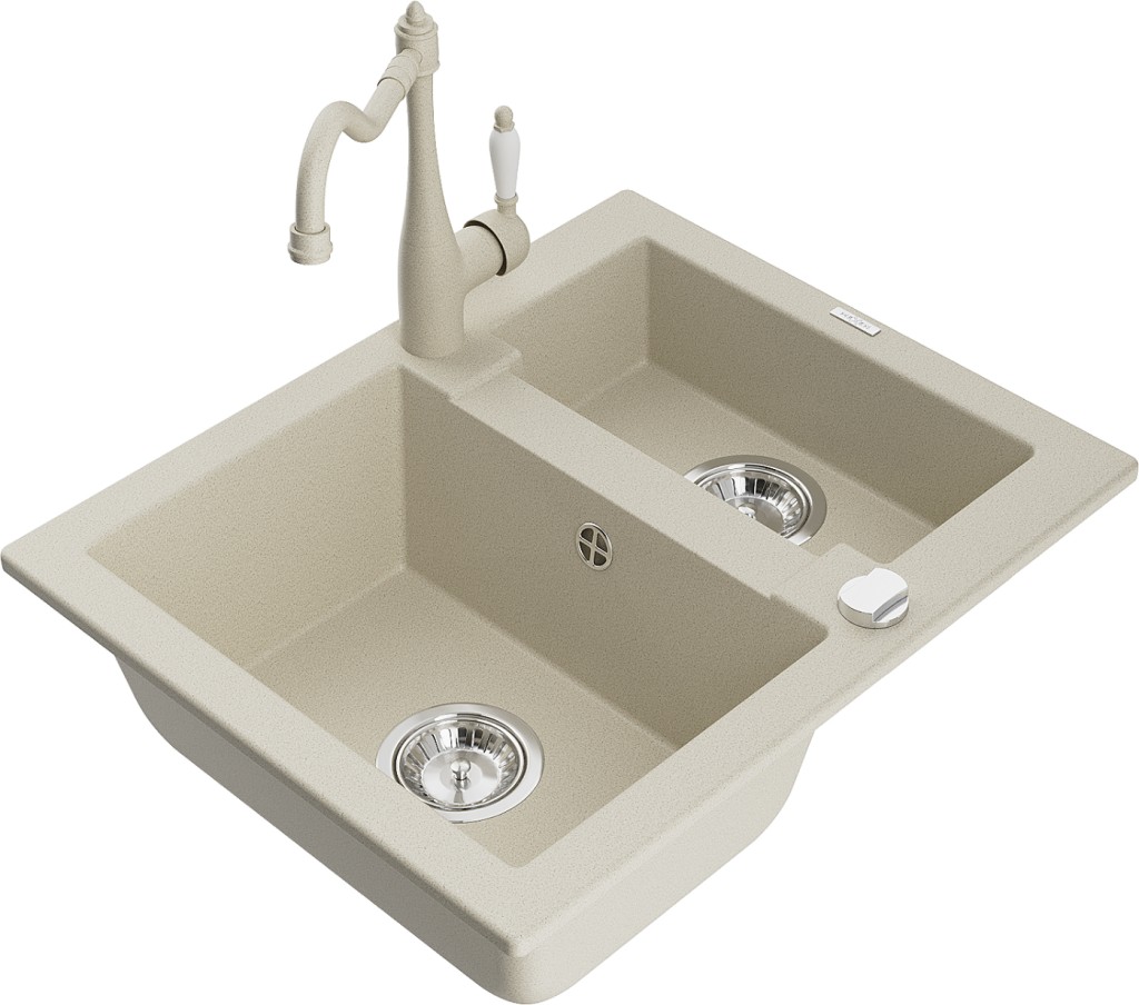 Technické dáta: drez: Rozmer: 582 x 475 x 177 mm Hĺbka komory: 162 mm (väčšia), 102 mm (menšia) Rozmery komory: 395x272 mm (väčšie), 375x182 mm (menšie) Priemer odtoku: ø90 mm Typ: 1,5 komory Typ: Zapustené do pracovnej dosky Farba béžová Povrchová úprava sifónu: Chrome Materiál: žula (80% žulové kamenivo, 20% živice) Prepadový otvor: Áno Otvory: (batérie, automatické) 2 Vysoká odolnosť proti poškriabaniu a zmene farby Odolnosť proti tepelným šokom Ľahko čistiteľný povrch Jeden dodatočný vyfrézovaný otvor na samodierovanie ø35 kuchynská batéria: Materiál: mosadz Farba béžová Hlava: Keramická Prevzdušňovač: Áno Typ: Jedna páka Výška batérie: 290 mm Rozsah výtoku: 260 mm(GT) Ean: 5905315042248