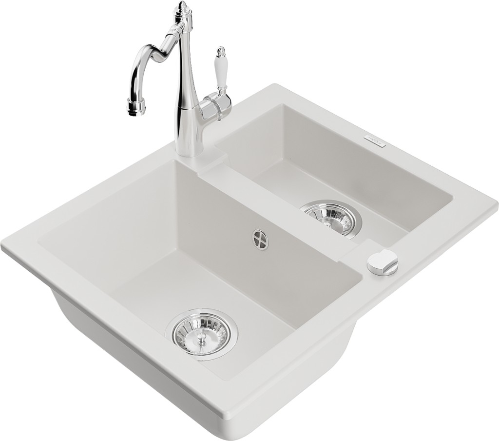 Technické dáta: drez: Rozmer: 582 x 475 x 177 mm Hĺbka komory: 162 mm (väčšia), 102 mm (menšia) Rozmery komory: 395x272 mm (väčšie), 375x182 mm (menšie) Priemer odtoku: ø90 mm Typ: 1,5 komory Typ: Zapustené do pracovnej dosky biela farba Povrchová úprava sifónu: Chrome Materiál: žula (80% žulové kamenivo, 20% živice) Prepadový otvor: Áno Otvory: (batérie, automatické) 2 Vysoká odolnosť proti poškriabaniu a zmene farby Odolnosť proti tepelným šokom Ľahko čistiteľný povrch Jeden dodatočný vyfrézovaný otvor na samodierovanie ø35 kuchynská batéria: Materiál: mosadz Farba: Chrome Hlava: Keramická Prevzdušňovač: Áno Typ: Jedna páka Výška batérie: 290 mm Rozsah výtoku: 260 mm (GT) Ean: 5905315042194