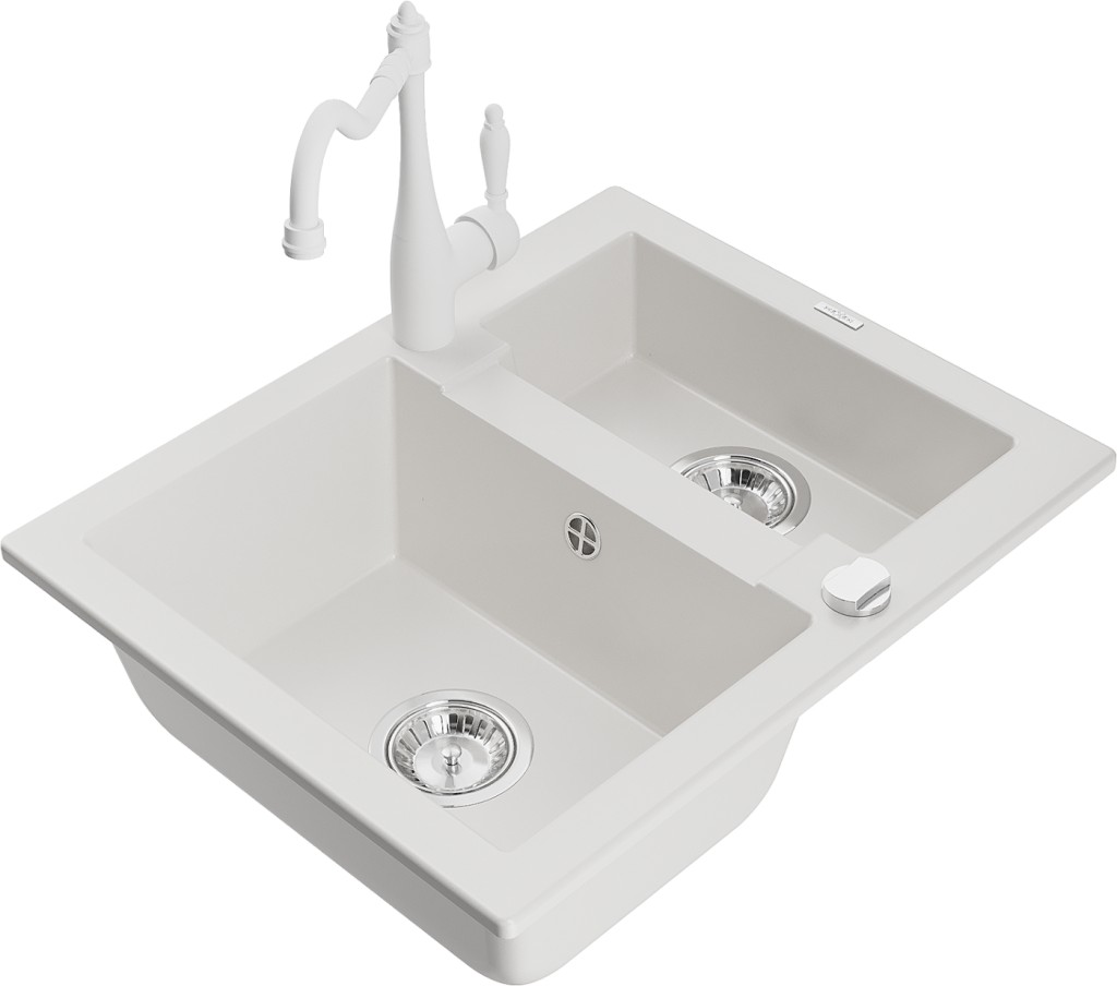 Technické dáta: drez: Rozmer: 582 x 475 x 177 mm Hĺbka komory: 162 mm (väčšia), 102 mm (menšia) Rozmery komory: 395x272 mm (väčšie), 375x182 mm (menšie) Priemer odtoku: ø90 mm Typ: 1,5 komory Typ: Zapustené do pracovnej dosky biela farba Povrchová úprava sifónu: Chrome Materiál: žula (80% žulové kamenivo, 20% živice) Prepadový otvor: Áno Otvory: (batérie, automatické) 2 Vysoká odolnosť proti poškriabaniu a zmene farby Odolnosť proti tepelným šokom Ľahko čistiteľný povrch Jeden dodatočný vyfrézovaný otvor na samodierovanie ø35 kuchynská batéria: Materiál: mosadz biela farba Hlava: Keramická Prevzdušňovač: Áno Typ: Jedna páka Výška batérie: 290 mm Rozsah výtoku: 260 mm(GT) Ean: 5905315042200