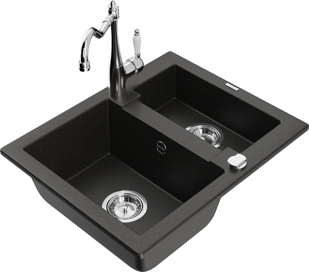 Technické dáta: drez: Rozmer: 582 x 475 x 177 mm Hĺbka komory: 162 mm (väčšia), 102 mm (menšia) Rozmery komory: 395x272 mm (väčšie), 375x182 mm (menšie) Priemer odtoku: ø90 mm Typ: 1,5 komory Typ: Zapustené do pracovnej dosky Farba: čierna / zlatá metalíza Povrchová úprava sifónu: Chrome Materiál: žula (80% žulové kamenivo, 20% živice) Prepadový otvor: Áno Otvory: (batérie, automatické) 2 Vysoká odolnosť proti poškriabaniu a zmene farby Odolnosť proti tepelným šokom Ľahko čistiteľný povrch Jeden dodatočný vyfrézovaný otvor na samodierovanie ø35 kuchynská batéria: Materiál: mosadz Farba: Chrome Hlava: Keramická Prevzdušňovač: Áno Typ: Jedna páka Výška batérie: 290 mm Rozsah výtoku: 260 mm(GT) Ean: 5905315042361