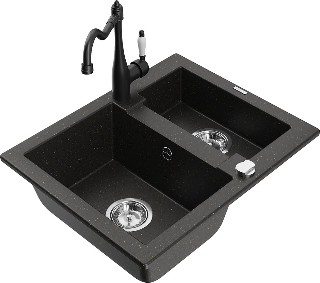 Technické dáta: drez: Rozmer: 582 x 475 x 177 mm Hĺbka komory: 162 mm (väčšia), 102 mm (menšia) Rozmery komory: 395x272 mm (väčšie), 375x182 mm (menšie) Priemer odtoku: ø90 mm Typ: 1,5 komory Typ: Zapustené do pracovnej dosky Farba: čierna / zlatá metalíza Povrchová úprava sifónu: Chrome Materiál: žula (80% žulové kamenivo, 20% živice) Prepadový otvor: Áno Otvory: (batérie, automatické) 2 Vysoká odolnosť proti poškriabaniu a zmene farby Odolnosť proti tepelným šokom Ľahko čistiteľný povrch Jeden dodatočný vyfrézovaný otvor na samodierovanie ø35 kuchynská batéria: Materiál: mosadz Čierna farba Hlava: Keramická Prevzdušňovač: Áno Typ: Jedna páka Výška batérie: 290 mm Rozsah výtoku: 260 mm(GT) Ean: 5905315042392