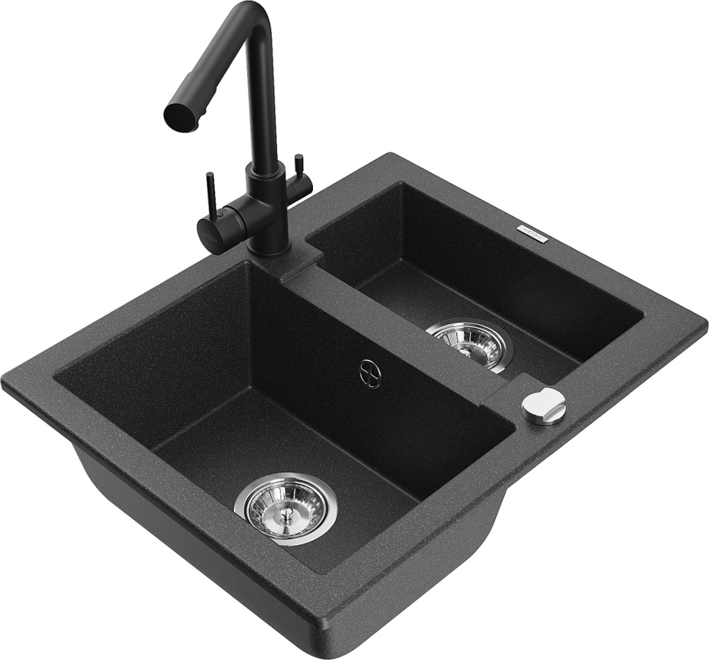 Technické dáta: Drez: Rozmer: 582x475x177 mm Hĺbka komory: 162 mm (väčšia), 102 mm (menšia) Rozmery komory: 395x272 mm (väčšie), 375x182 mm (menšie) Priemer odtoku: ø90 mm Typ: 1,5-komorový Typ: Zapustené do pracovnej dosky Farba: Škvrnitá čierna Povrchová úprava sifónu: Chrome Materiál: žula (80% žulové kamenivo 20% živice) Prepadový otvor: Áno Otvory: (batérie, automat) 2 Vysoká odolnosť proti poškriabaniu a zmene farby Odolnosť proti tepelným šokom Povrch pre ľahké čistenie Jeden dodatočný vyfrézovaný otvor na samodierovanie ø35 Kuchynská batéria: Materiál: mosadz Čierna farba Hlava: Keramická Perlátor: Áno Typ: Dve rukoväte Rozsah výtoku: 235 mm Výška batérie: 315 mm Dvojhlavá batéria s prídavným filtrom na pitnú vodu(GT) Ean: 5905315027054