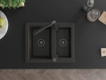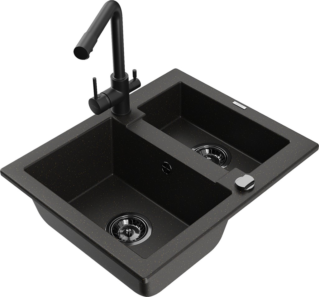 Technické dáta: Drez: Rozmer: 582x475x177 mm Hĺbka komory: 162 mm (väčšia), 102 mm (menšia) Rozmery komory: 395x272 mm (väčšie), 375x182 mm (menšie) Priemer odtoku: ø90 mm Typ: 1,5-komorový Typ: Zapustené do pracovnej dosky Farba: čierna / zlatá metalíza Povrchová úprava sifónu: čierna Materiál: žula (80% žulové kamenivo 20% živice) Prepadový otvor: Áno Otvory: (batérie, automat) 2 Vysoká odolnosť proti poškriabaniu a zmene farby Odolnosť proti tepelným šokom Povrch pre ľahké čistenie Jeden dodatočný vyfrézovaný otvor na samodierovanie ø35 Kuchynská batéria: Materiál: mosadz Čierna farba Hlava: Keramická Perlátor: Áno Typ: Dve rukoväte Rozsah výtoku: 235 mm Výška batérie: 315 mm Dvojhlavá batéria s prídavným filtrom na pitnú vodu(GT) Ean: 5905315027023
