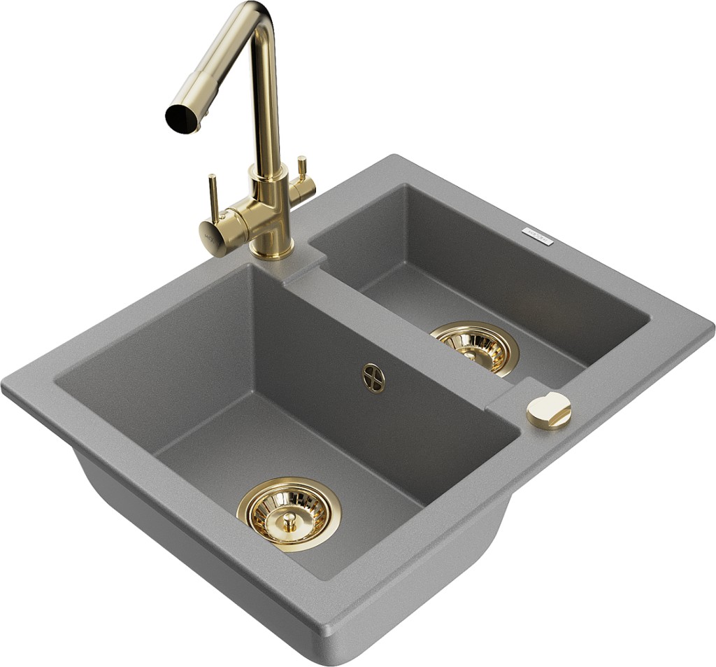 Technické dáta: drez: Rozmer: 582 x 475 x 177 mm Hĺbka komory: 162 mm (väčšia), 102 mm (menšia) Rozmery komory: 395x272 mm (väčšie), 375x182 mm (menšie) Priemer odtoku: ø90 mm Typ: 1,5 komory Typ: Zapustené do pracovnej dosky Šedá farba Povrchová úprava sifónu: zlatá Materiál: žula (80% žulové kamenivo, 20% živice) Prepadový otvor: Áno Otvory: (batérie, automatické) 2 Vysoká odolnosť proti poškriabaniu a zmene farby Odolnosť proti tepelným šokom Ľahko čistiteľný povrch Jeden dodatočný vyfrézovaný otvor na samodierovanie ø35 kuchynská batéria: Materiál: mosadz Farba: Zlatá Hlava: Keramická Prevzdušňovač: Áno Typ: Dve rukoväte Rozsah výtoku: 235 mm Výška batérie: 315 mm Dvojhlavá batéria s prídavným filtrom na pitnú vodu(GT) Ean: 5905315026903