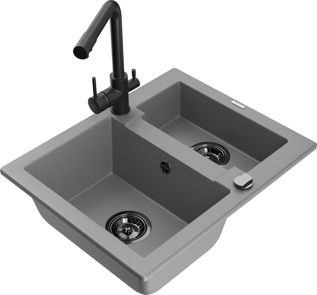 Technické dáta: drez: Rozmer: 582 x 475 x 177 mm Hĺbka komory: 162 mm (väčšia), 102 mm (menšia) Rozmery komory: 395x272 mm (väčšie), 375x182 mm (menšie) Priemer odtoku: ø90 mm Typ: 1,5 komory Typ: Zapustené do pracovnej dosky Šedá farba Povrchová úprava sifónu: čierna Materiál: žula (80% žulové kamenivo, 20% živice) Prepadový otvor: Áno Otvory: (batérie, automatické) 2 Vysoká odolnosť proti poškriabaniu a zmene farby Odolnosť proti tepelným šokom Ľahko čistiteľný povrch Jeden dodatočný vyfrézovaný otvor na samodierovanie ø35 kuchynská batéria: Materiál: mosadz Čierna farba Hlava: Keramická Prevzdušňovač: Áno Typ: Dve rukoväte Rozsah výtoku: 235 mm Výška batérie: 315 mm Dvojhlavá batéria s prídavným filtrom na pitnú vodu(GT) Ean: 5905315026927