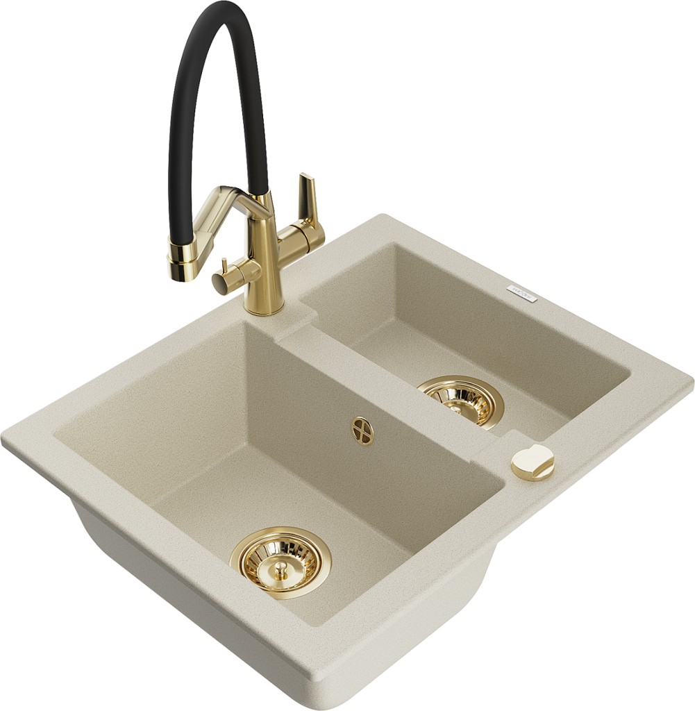 Technické dáta: Drez: Rozmer: 582x475x177 mm Hĺbka komory: 162 mm (väčšia), 102 mm (menšia) Rozmery komory: 395x272 mm (väčšie), 375x182 mm (menšie) Priemer odtoku: ø90 mm Typ: 1,5-komorový Typ: Zapustené do pracovnej dosky Farba béžová Povrchová úprava sifónu: zlatá Materiál: žula (80% žulové kamenivo 20% živice) Prepadový otvor: Áno Otvory: (batérie, automat) 2 Vysoká odolnosť proti poškriabaniu a zmene farby Odolnosť proti tepelným šokom Povrch pre ľahké čistenie Kuchynská batéria: Materiál: mosadz Farba: Zlatá/Čierna Hlavy: Keramické Perlátor: Áno Typ výtoku: Flexibilný s mosadznou podperou Rozsah výtoku: 260 mm Výška: 405 mm Typ: Dve rukoväte Dvojhlavá batéria s prídavným filtrom na pitnú vodu(GT) Ean: 5905315055620