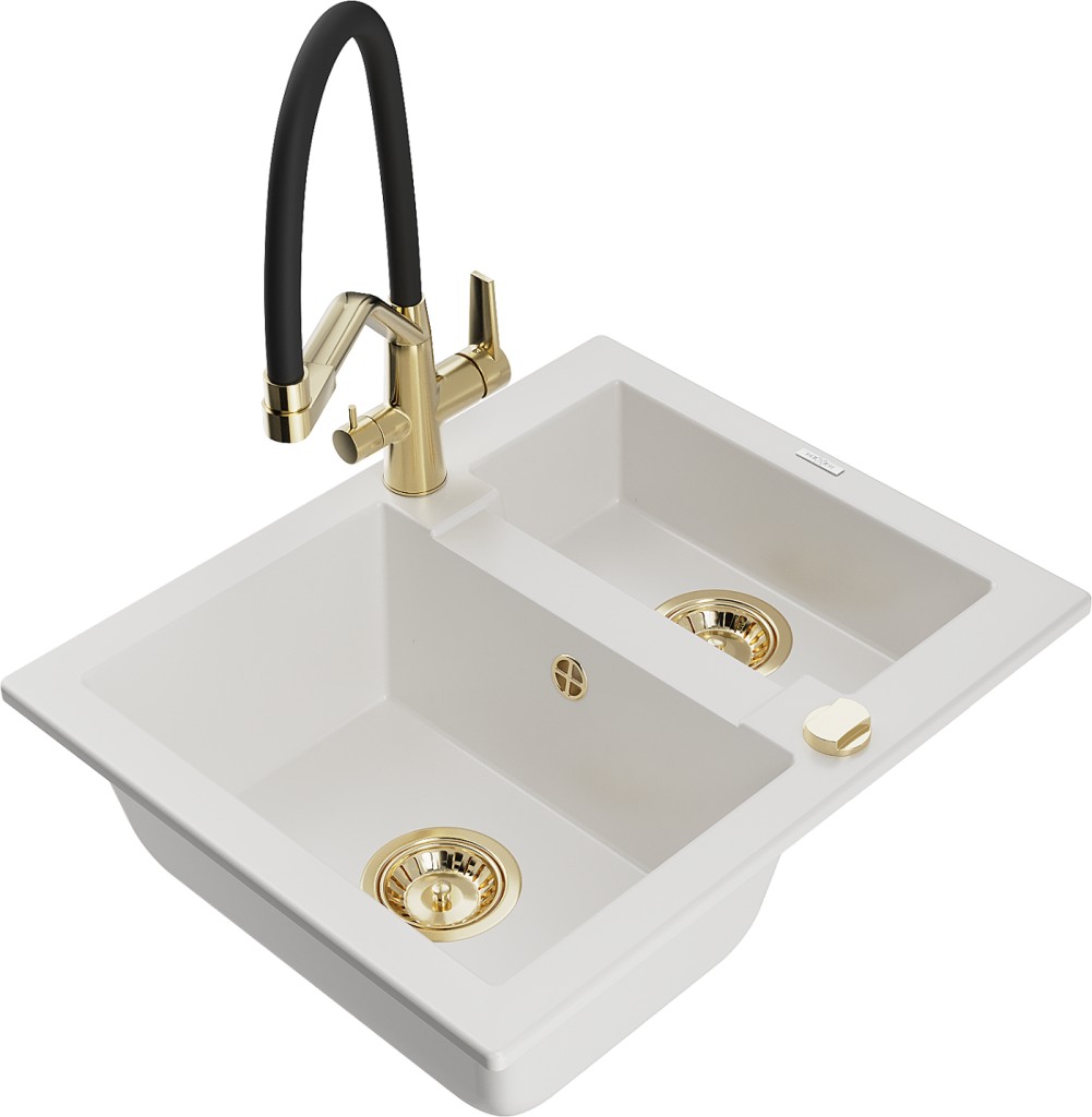 Technické dáta: drez: Rozmer: 582 x 475 x 177 mm Hĺbka komory: 162 mm (väčšia), 102 mm (menšia) Rozmery komory: 395x272 mm (väčšie), 375x182 mm (menšie) Priemer odtoku: ø90 mm Typ: 1,5 komory Typ: Zapustené do pracovnej dosky biela farba Povrchová úprava sifónu: zlatá Materiál: žula (80% žulové kamenivo, 20% živice) Prepadový otvor: Áno Otvory: (batérie, automatické) 2 Vysoká odolnosť proti poškriabaniu a zmene farby Odolnosť proti tepelným šokom Ľahko čistiteľný povrch kuchynská batéria: Materiál: mosadz Farba: Zlatá/Čierna Hlavy: Keramické Prevzdušňovač: Áno Typ hubica: Flexibilný s mosadzným držiakom Rozsah výtoku: 260 mm Výška: 405 mm Typ: Dve rukoväte Dvojhlavá batéria s prídavným filtrom na pitnú vodu(GT) Ean: 5905315055569