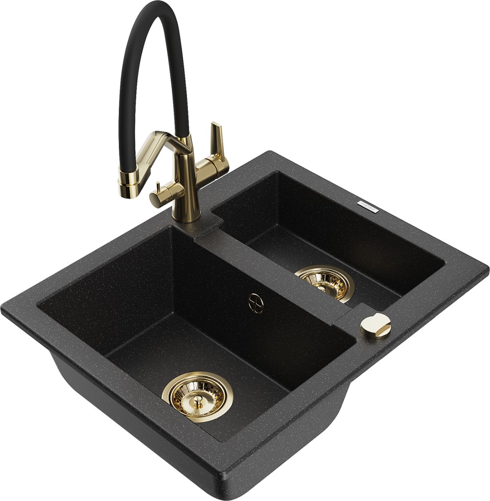 Technické dáta: Drez: Rozmer: 582x475x177 mm Hĺbka komory: 162 mm (väčšia), 102 mm (menšia) Rozmery komory: 395x272 mm (väčšie), 375x182 mm (menšie) Priemer odtoku: ø90 mm Typ: 1,5-komorový Typ: Zapustené do pracovnej dosky Farba: čierna/strieborná metalíza Povrchová úprava sifónu: zlatá Materiál: žula (80% žulové kamenivo 20% živice) Prepadový otvor: Áno Otvory: (batérie, automat) 2 Vysoká odolnosť proti poškriabaniu a zmene farby Odolnosť proti tepelným šokom Povrch pre ľahké čistenie Kuchynská batéria: Materiál: mosadz Farba: Zlatá/Čierna Hlavy: Keramické Perlátor: Áno Typ výtoku: Flexibilný s mosadznou podperou Rozsah výtoku: 260 mm Výška: 405 mm Typ: Dve rukoväte Dvojhlavá batéria s prídavným filtrom na pitnú vodu(GT) Ean: 5905315055743