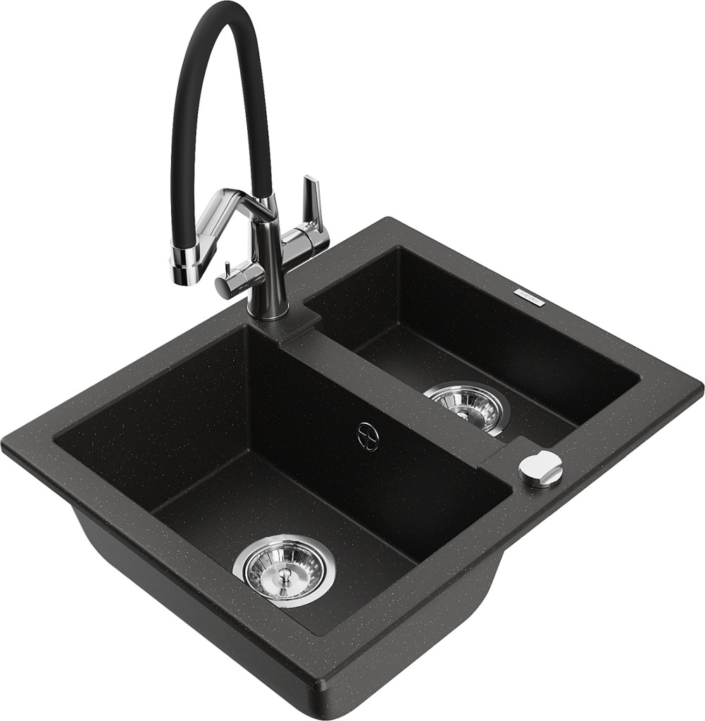 Technické dáta: Drez: Rozmer: 582x475x177 mm Hĺbka komory: 162 mm (väčšia), 102 mm (menšia) Rozmery komory: 395x272 mm (väčšie), 375x182 mm (menšie) Priemer odtoku: ø90 mm Typ: 1,5-komorový Typ: Zapustené do pracovnej dosky Farba: čierna / zlatá metalíza Povrchová úprava sifónu: Chrome Materiál: žula (80% žulové kamenivo 20% živice) Prepadový otvor: Áno Otvory: (batérie, automat) 2 Vysoká odolnosť proti poškriabaniu a zmene farby Odolnosť proti tepelným šokom Povrch pre ľahké čistenie Kuchynská batéria: Materiál: mosadz Farba: chróm/čierna Hlavy: Keramické Perlátor: Áno Typ výtoku: Flexibilný s mosadznou podperou Rozsah výtoku: 260 mm Výška: 405 mm Typ: Dve rukoväte Dvojhlavá batéria s prídavným filtrom na pitnú vodu(GT) Ean: 5905315055781