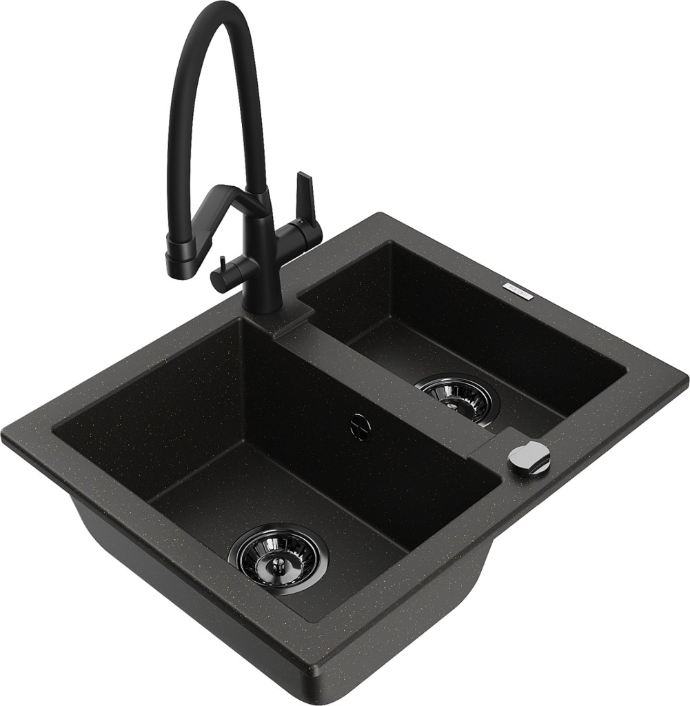 Technické dáta: Drez: Rozmer: 582x475x177 mm Hĺbka komory: 162 mm (väčšia), 102 mm (menšia) Rozmery komory: 395x272 mm (väčšie), 375x182 mm (menšie) Priemer odtoku: ø90 mm Typ: 1,5-komorový Typ: Zapustené do pracovnej dosky Farba: čierna / zlatá metalíza Povrchová úprava sifónu: čierna Materiál: žula (80% žulové kamenivo 20% živice) Prepadový otvor: Áno Otvory: (batérie, automat) 2 Vysoká odolnosť proti poškriabaniu a zmene farby Odolnosť proti tepelným šokom Povrch pre ľahké čistenie Kuchynská batéria: Materiál: mosadz Čierna farba Hlavy: Keramické Perlátor: Áno Typ výtoku: Flexibilný s mosadznou podperou Rozsah výtoku: 260 mm Výška: 405 mm Typ: Dve rukoväte Dvojhlavá batéria s prídavným filtrom na pitnú vodu(GT) Ean: 5905315055828