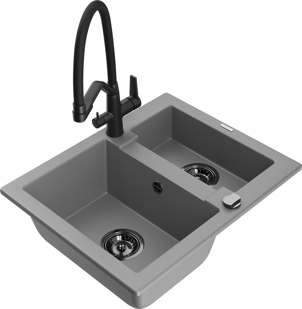 Technické dáta: drez: Rozmer: 582 x 475 x 177 mm Hĺbka komory: 162 mm (väčšia), 102 mm (menšia) Rozmery komory: 395x272 mm (väčšie), 375x182 mm (menšie) Priemer odtoku: ø90 mm Typ: 1,5 komory Typ: Zapustené do pracovnej dosky Šedá farba Povrchová úprava sifónu: čierna Materiál: žula (80% žulové kamenivo, 20% živice) Prepadový otvor: Áno Otvory: (batérie, automatické) 2 Vysoká odolnosť proti poškriabaniu a zmene farby Odolnosť proti tepelným šokom Ľahko čistiteľný povrch kuchynská batéria: Materiál: mosadz Čierna farba Hlavy: Keramické Prevzdušňovač: Áno Typ hubica: Flexibilný s mosadzným držiakom Rozsah výtoku: 260 mm Výška: 405 mm Typ: Dve rukoväte Dvojhlavá batéria s prídavným filtrom na pitnú vodu(GT) Ean: 5905315055705