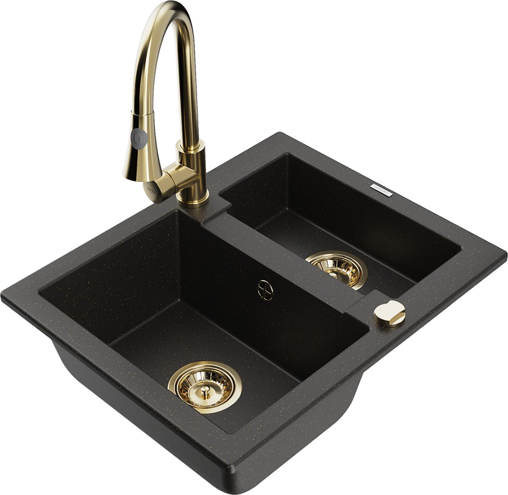Technické dáta: drez: Rozmer: 582 x 475 x 177 mm Hĺbka komory: 162 mm (väčšia), 102 mm (menšia) Rozmery komory: 395x272 mm (väčšie), 375x182 mm (menšie) Priemer odtoku: ø90 mm Typ: 1,5 komory Typ: Zapustené do pracovnej dosky Farba: čierna / zlatá metalíza Povrchová úprava sifónu: zlatá Materiál: žula (80% žulové kamenivo, 20% živice) Prepadový otvor: Áno Otvory: (batérie, automatické) 2 Vysoká odolnosť proti poškriabaniu a zmene farby Odolnosť proti tepelným šokom Ľahko čistiteľný povrch Jeden dodatočný vyfrézovaný otvor na samodierovanie ø35 kuchynská batéria: Materiál: mosadz Farba: Zlatá Hlava: Keramická Prevzdušňovač: Áno Typ: Jedna páka Výška batérie: 380 mm Rozsah výtoku: 252 mm Typ výtoku: Výsuvný(GT) Ean: 5905315032119
