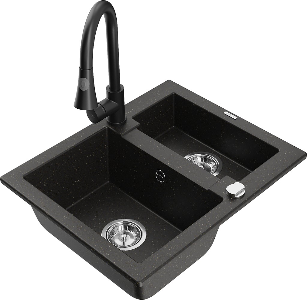 Technické dáta: drez: Rozmer: 582 x 475 x 177 mm Hĺbka komory: 162 mm (väčšia), 102 mm (menšia) Rozmery komory: 395x272 mm (väčšie), 375x182 mm (menšie) Priemer odtoku: ø90 mm Typ: 1,5 komory Typ: Zapustené do pracovnej dosky Farba: čierna / zlatá metalíza Povrchová úprava sifónu: Chrome Materiál: žula (80% žulové kamenivo, 20% živice) Prepadový otvor: Áno Otvory: (batérie, automatické) 2 Vysoká odolnosť proti poškriabaniu a zmene farby Odolnosť proti tepelným šokom Ľahko čistiteľný povrch Jeden dodatočný vyfrézovaný otvor na samodierovanie ø35 kuchynská batéria: Materiál: mosadz Čierna farba Hlava: Keramická Prevzdušňovač: Áno Typ: Jedna páka Výška batérie: 380 mm Rozsah výtoku: 252 mm Typ výtoku: Výsuvný(GT) Ean: 5905315032133