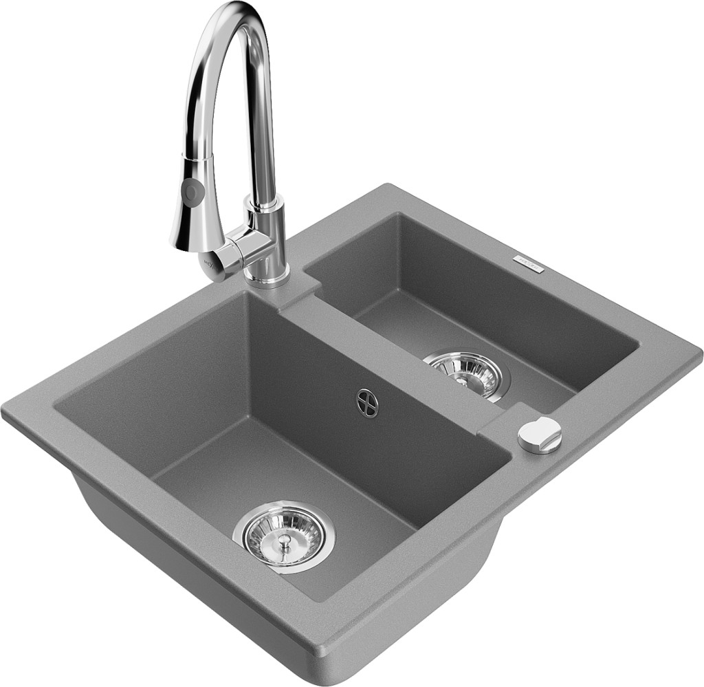 Technické dáta: drez: Rozmer: 582 x 475 x 177 mm Hĺbka komory: 162 mm (väčšia), 102 mm (menšia) Rozmery komory: 395x272 mm (väčšie), 375x182 mm (menšie) Priemer odtoku: ø90 mm Typ: 1,5 komory Typ: Zapustené do pracovnej dosky Šedá farba Povrchová úprava sifónu: Chrome Materiál: žula (80% žulové kamenivo, 20% živice) Prepadový otvor: Áno Otvory: (batérie, automatické) 2 Vysoká odolnosť proti poškriabaniu a zmene farby Odolnosť proti tepelným šokom Ľahko čistiteľný povrch Jeden dodatočný vyfrézovaný otvor na samodierovanie ø35 kuchynská batéria: Materiál: mosadz Farba: Chrome Hlava: Keramická Prevzdušňovač: Áno Typ: Jedna páka Výška batérie: 380 mm Rozsah výtoku: 252 mm Typ výtoku: Výsuvný(GT) Ean: 5905315032010