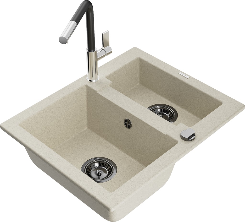 Technické dáta: drez: Rozmer: 582 x 475 x 177 mm Hĺbka komory: 162 mm (väčšia), 102 mm (menšia) Rozmery komory: 395x272 mm (väčšie), 375x182 mm (menšie) Priemer odtoku: ø90 mm Typ: 1,5 komory Typ: Zapustené do pracovnej dosky Farba béžová Povrchová úprava sifónu: čierna Materiál: žula (80% žulové kamenivo, 20% živice) Prepadový otvor: Áno Otvory: (batérie, automatické) 2 Vysoká odolnosť proti poškriabaniu a zmene farby Odolnosť proti tepelným šokom Ľahko čistiteľný povrch Jeden dodatočný vyfrézovaný otvor na samodierovanie ø35 kuchynská batéria: Materiál: mosadz Farba: chróm/čierna Hlava: Keramická Prevzdušňovač: Áno Typ: Jedna páka Rozsah výtoku: 245 mm Výška batérie: 307 mm(GT) Ean: 5905315063557