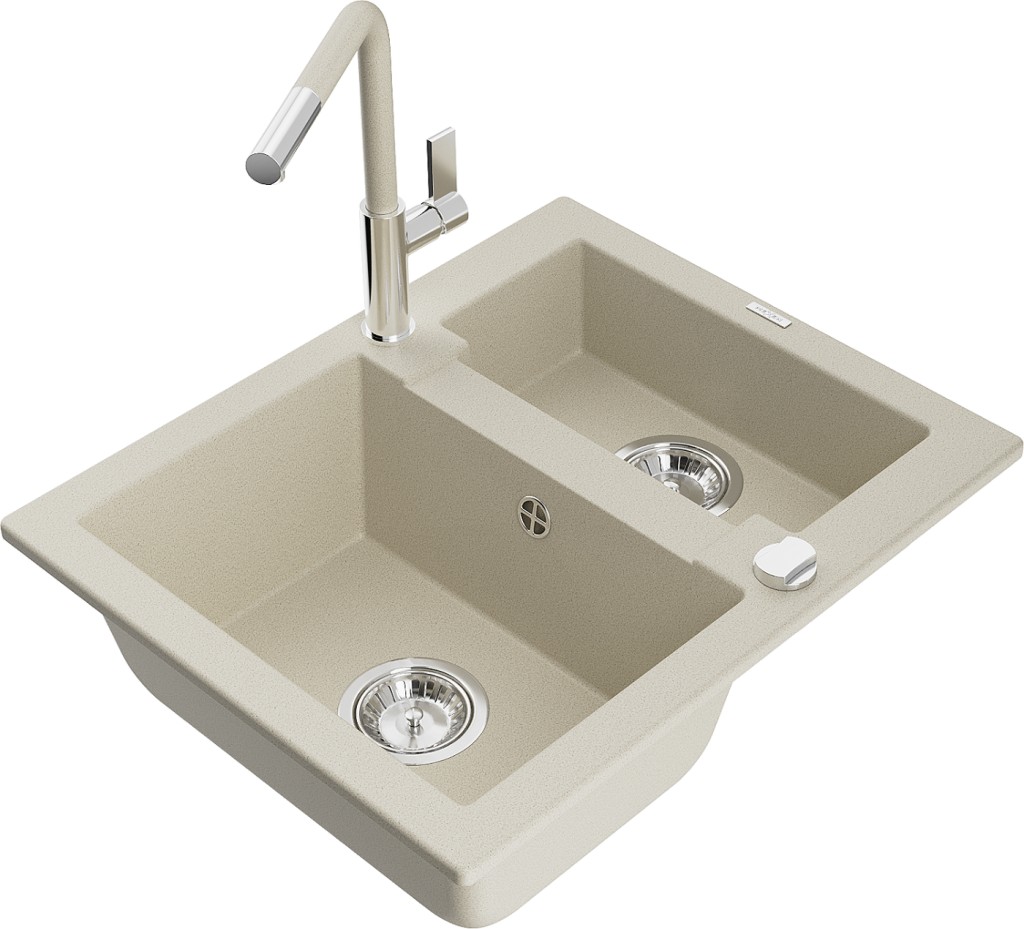 Technické dáta: drez: Rozmer: 582 x 475 x 177 mm Hĺbka komory: 162 mm (väčšia), 102 mm (menšia) Rozmery komory: 395x272 mm (väčšie), 375x182 mm (menšie) Priemer odtoku: ø90 mm Typ: 1,5 komory Typ: Zapustené do pracovnej dosky Farba béžová Povrchová úprava sifónu: Chrome Materiál: žula (80% žulové kamenivo, 20% živice) Prepadový otvor: Áno Otvory: (batérie, automatické) 2 Vysoká odolnosť proti poškriabaniu a zmene farby Odolnosť proti tepelným šokom Ľahko čistiteľný povrch Jeden dodatočný vyfrézovaný otvor na samodierovanie ø35 kuchynská batéria: Materiál: mosadz Farba: chróm/béžová Hlava: Keramická Prevzdušňovač: Áno Typ: Jedna páka Rozsah výtoku: 245 mm Výška batérie: 307 mm(GT) Ean: 5905315063564