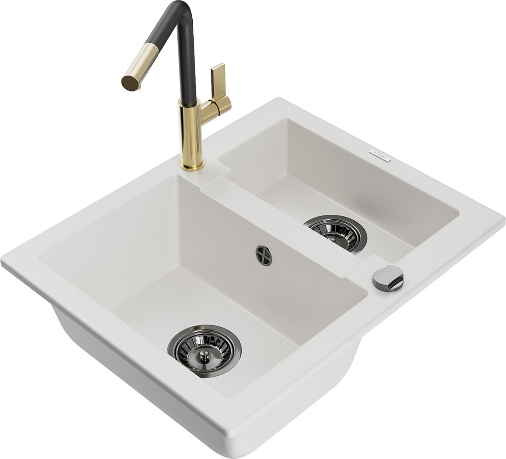 Technické dáta: drez: Rozmer: 582 x 475 x 177 mm Hĺbka komory: 162 mm (väčšia), 102 mm (menšia) Rozmery komory: 395x272 mm (väčšie), 375x182 mm (menšie) Priemer odtoku: ø90 mm Typ: 1,5 komory Typ: Zapustené do pracovnej dosky biela farba Povrchová úprava sifónu: čierna Materiál: žula (80% žulové kamenivo, 20% živice) Prepadový otvor: Áno Otvory: (batérie, automatické) 2 Vysoká odolnosť proti poškriabaniu a zmene farby Odolnosť proti tepelným šokom Ľahko čistiteľný povrch Jeden dodatočný vyfrézovaný otvor na samodierovanie ø35 kuchynská batéria: Materiál: mosadz Farba: Zlatá/Čierna Hlava: Keramická Prevzdušňovač: Áno Typ: Jedna páka Rozsah výtoku: 245 mm Výška batérie: 307 mm(GT) Ean: 5905315063519